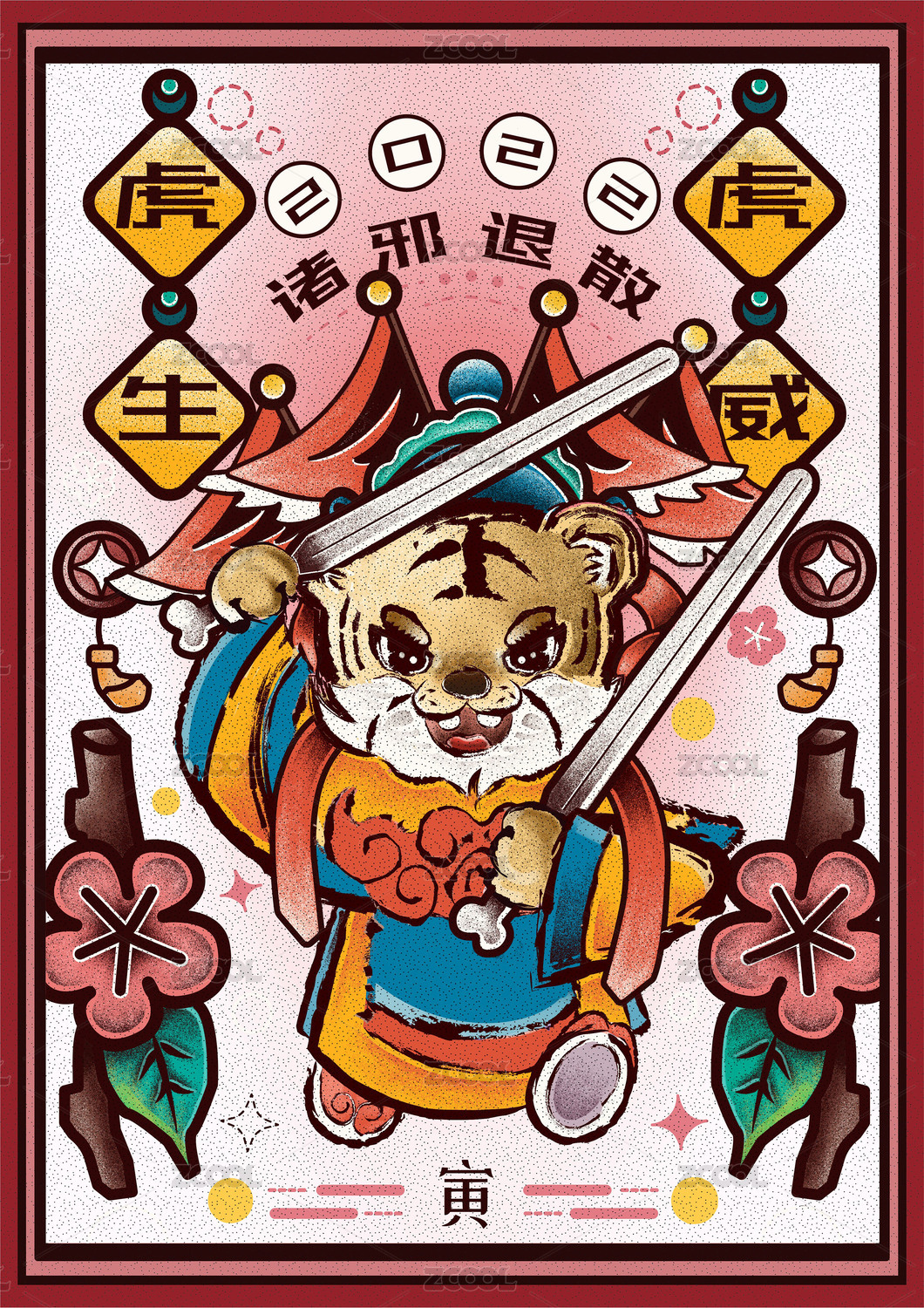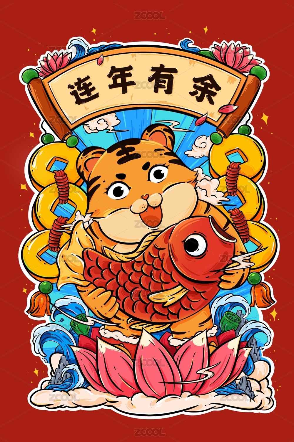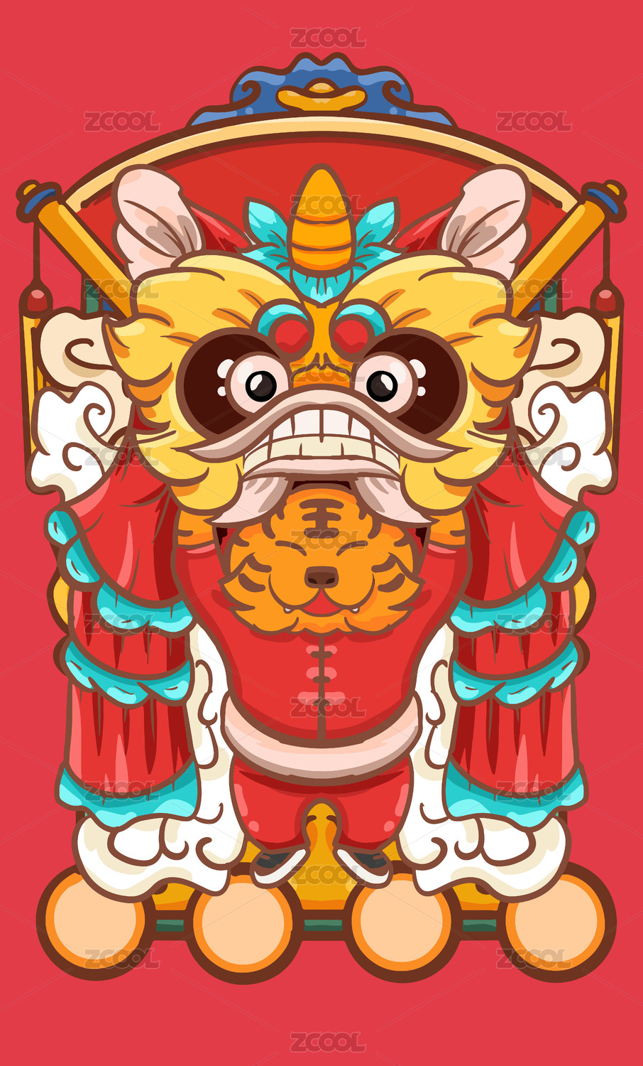 国潮虎年大吉日进斗金老虎财神竖版插画