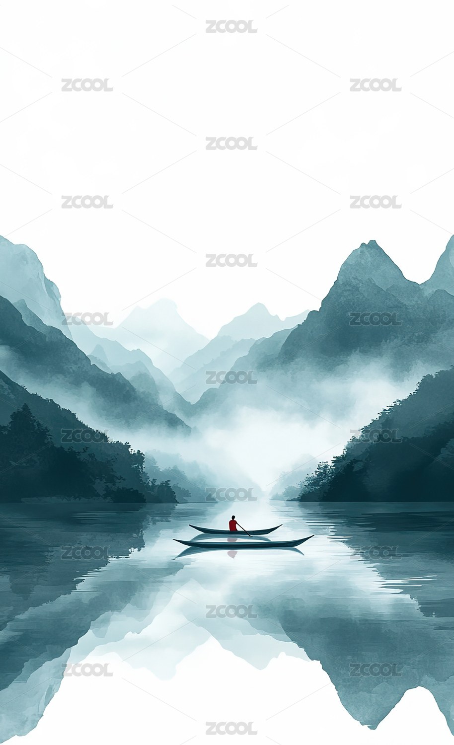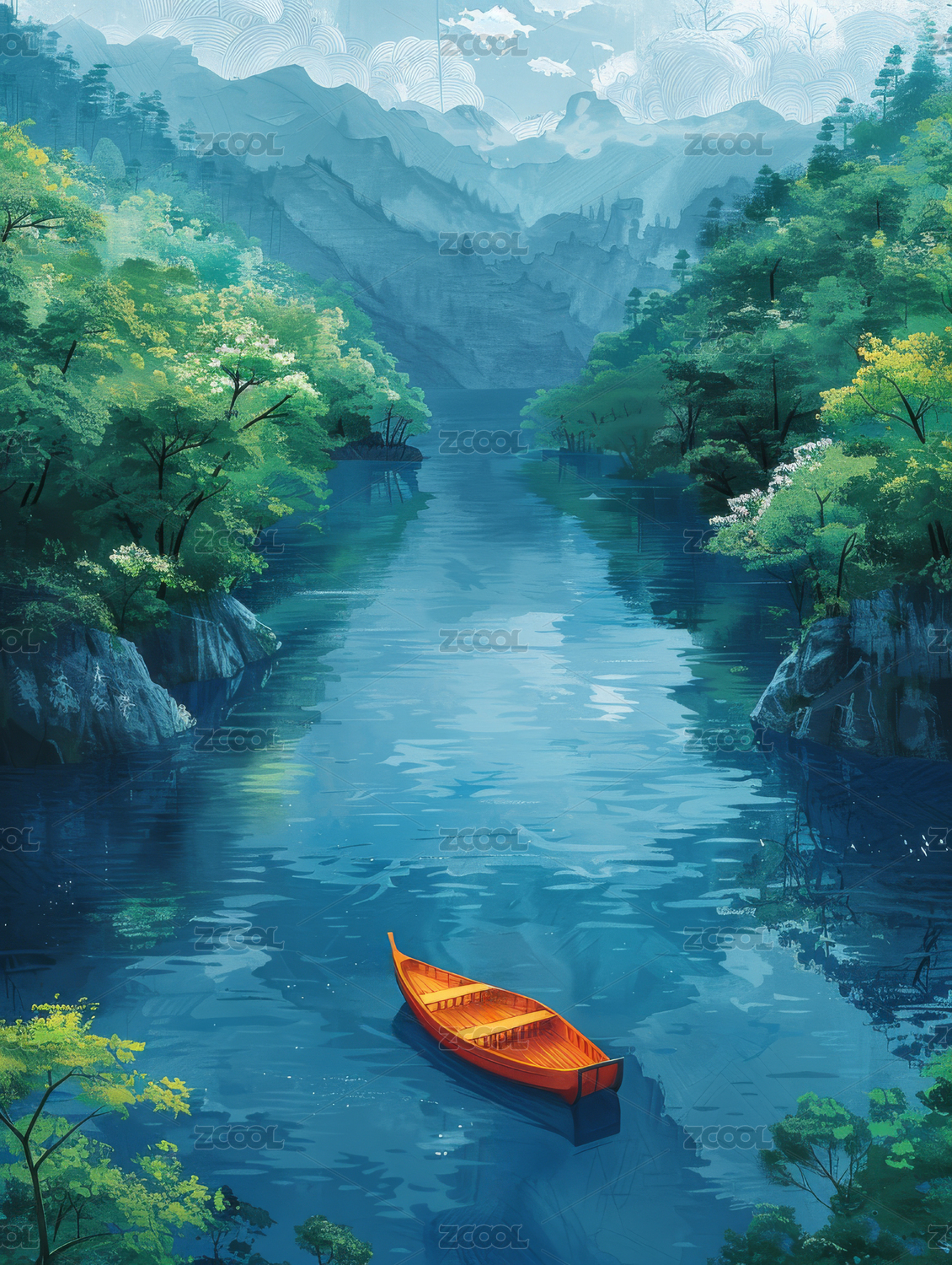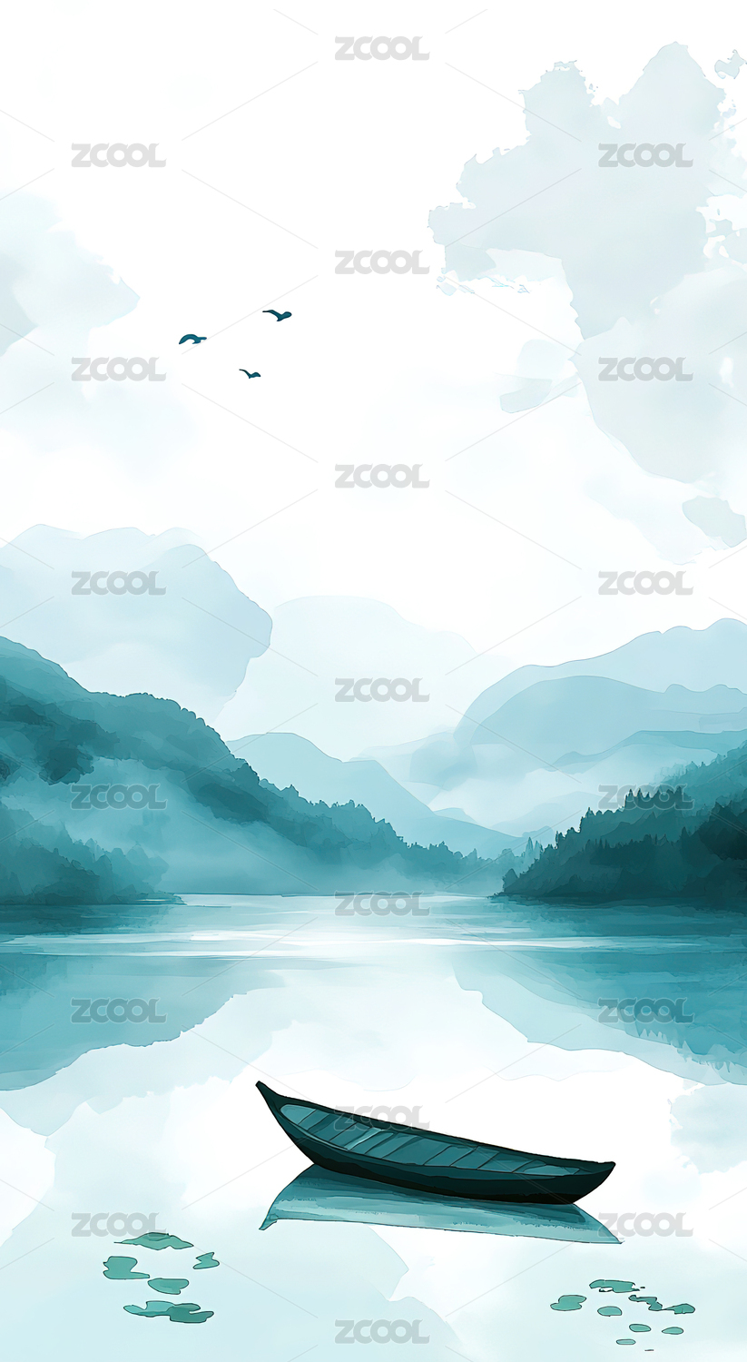 绿蓝白河流小船高山插画海报背景