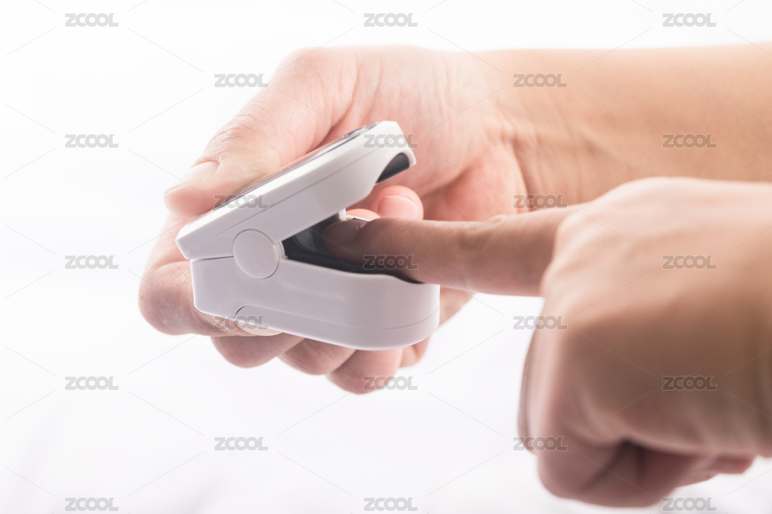 正在将手指放入血氧仪中进行检测