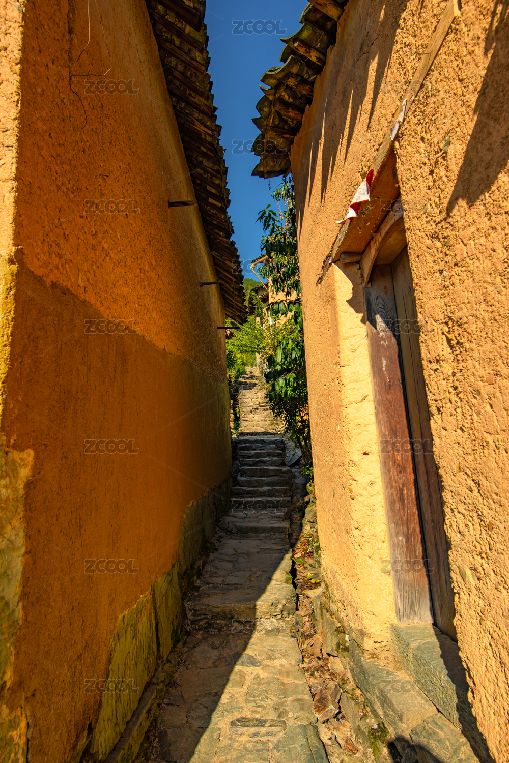 无人,户外,黄色,树,白昼,古老的,建筑,路,树林,森林