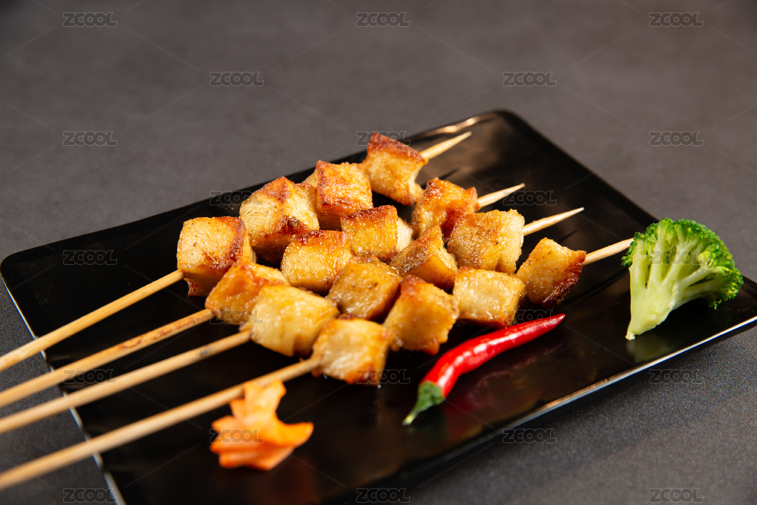 室内黑色桌子上的一盘烧烤鱼豆腐