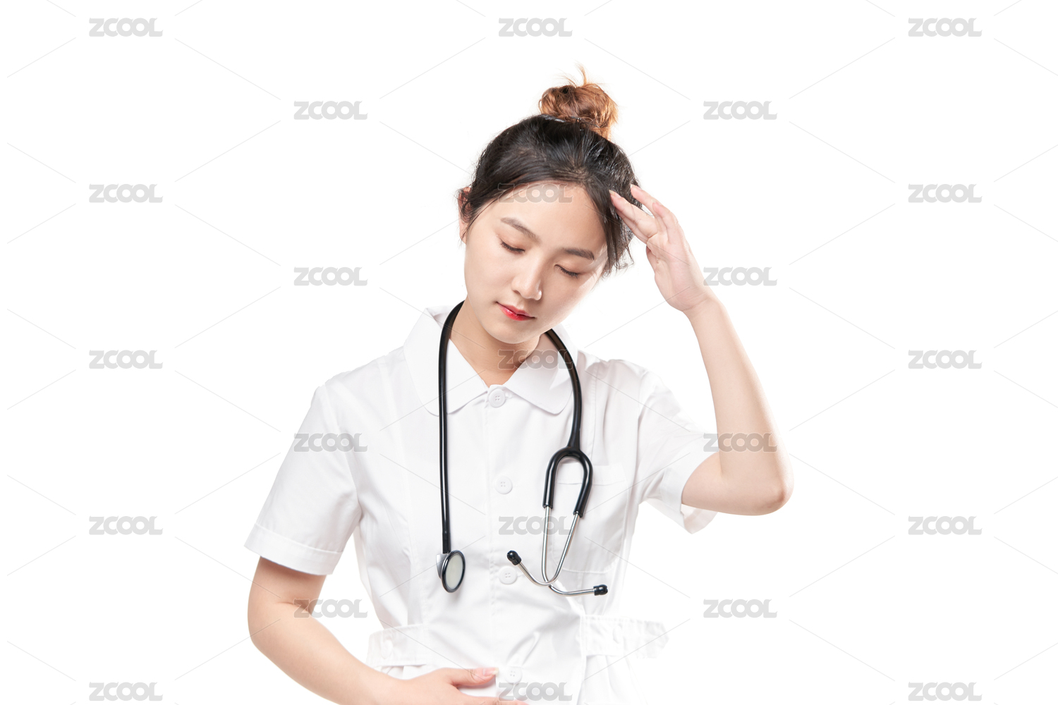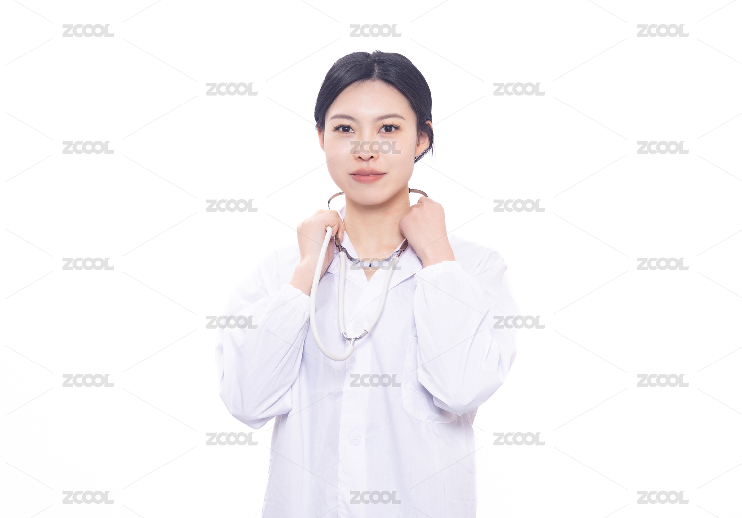 白色背景下中国美丽的美女白衣天使护士医生拿着听诊器