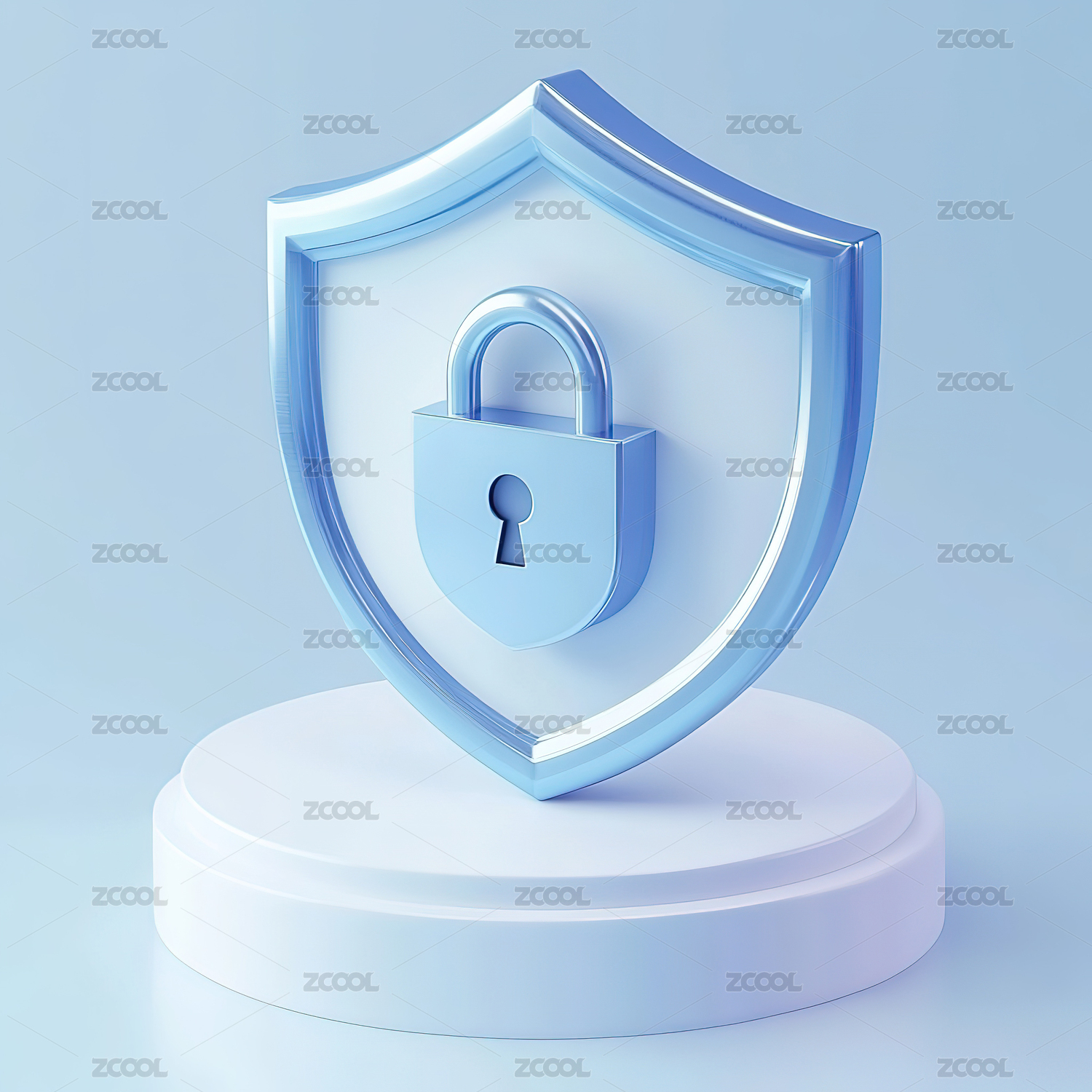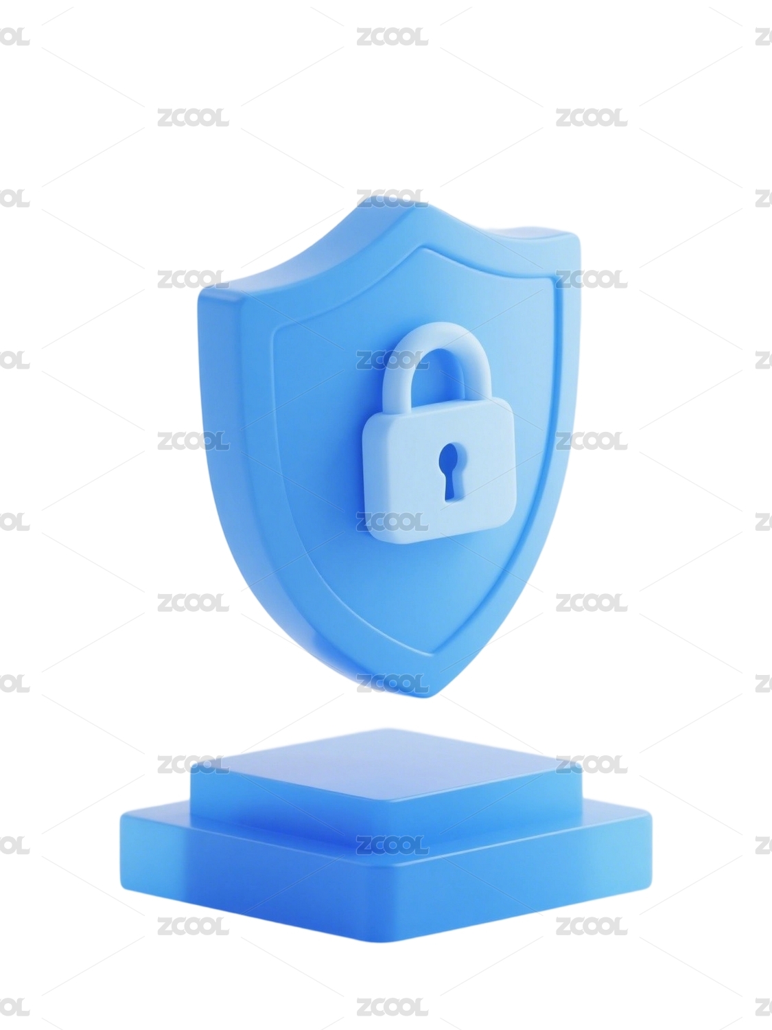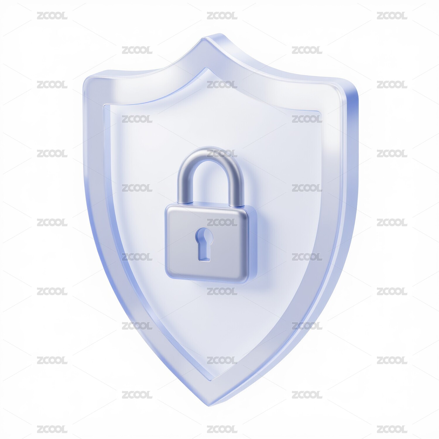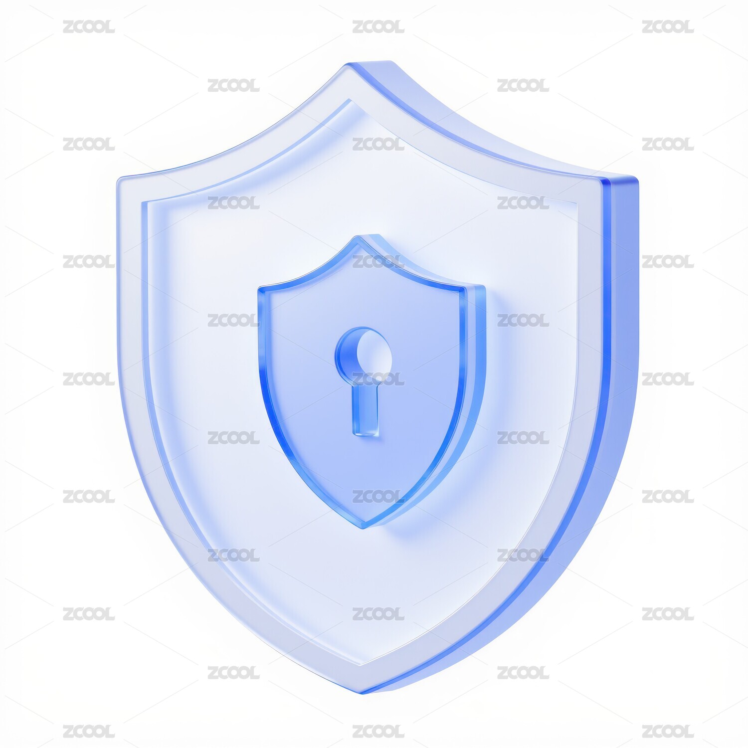 盾牌图标,锁图标,3D图标,前视图,UI设计,蓝白配色,磨砂玻璃,透明效果,干净白色背景,科技感