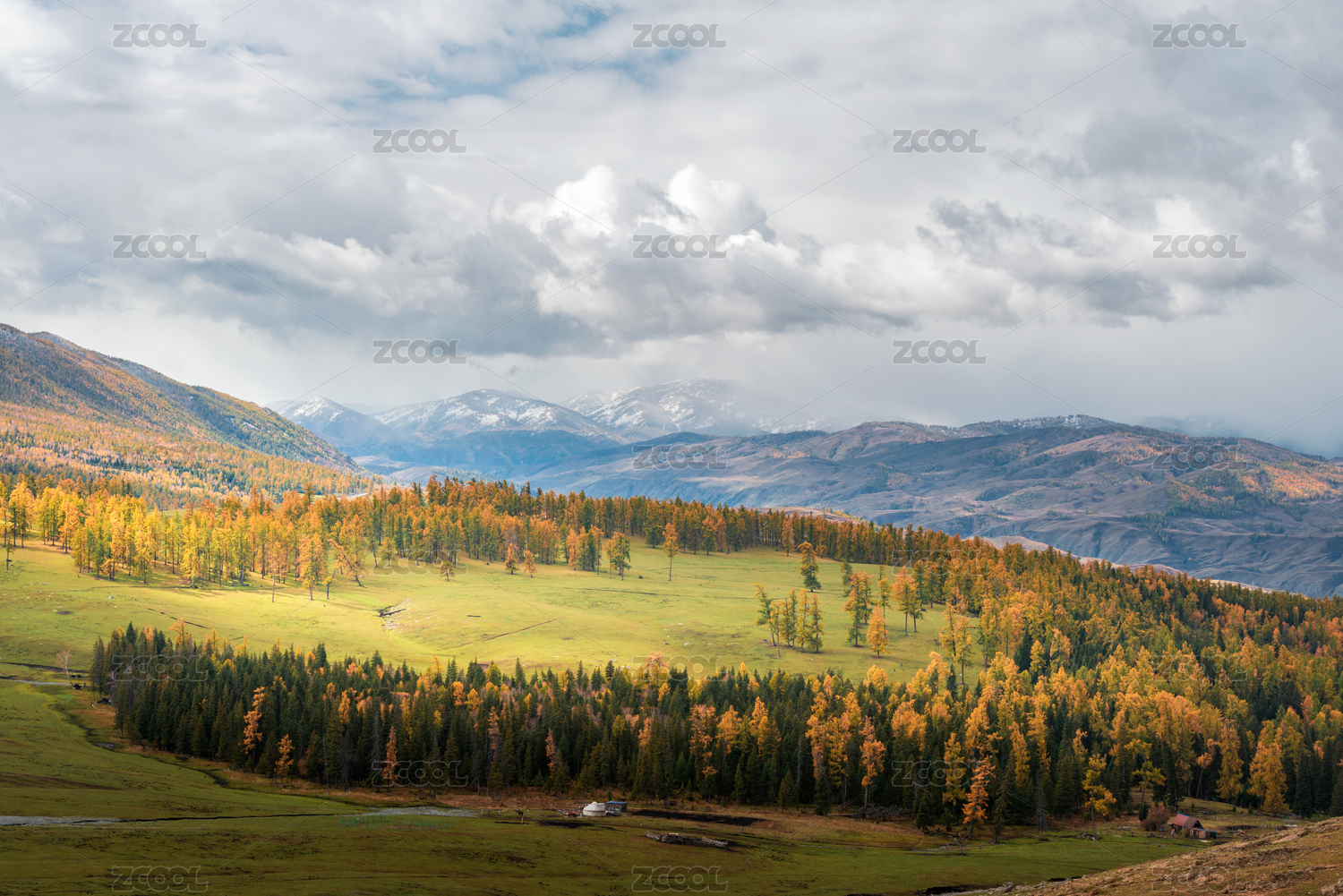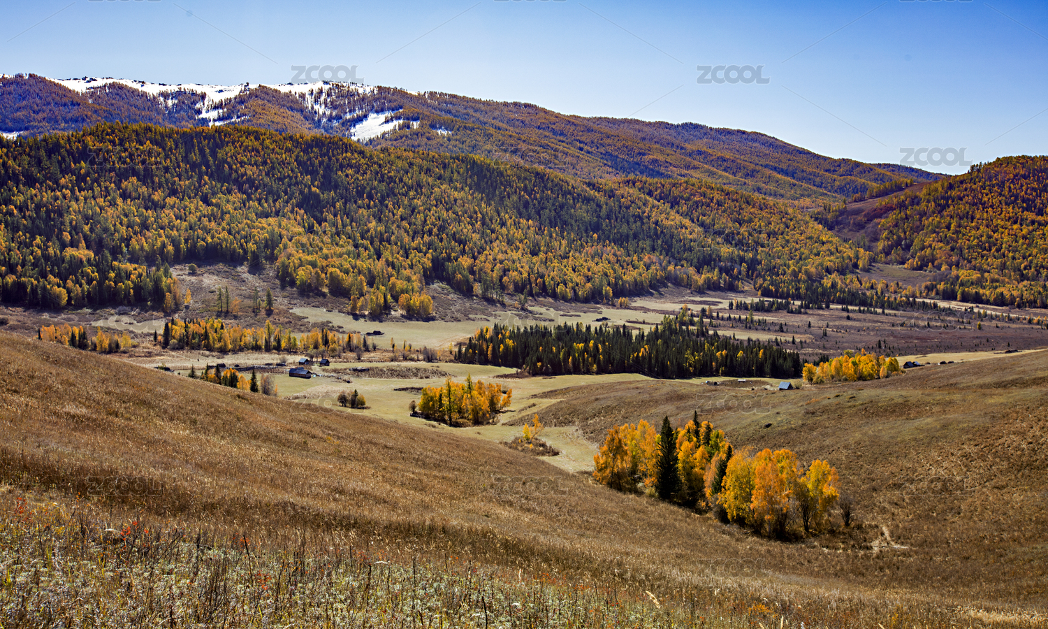 亚洲,中国,新疆,喀纳斯,树,秋天,黄色,草甸,牧场,高山