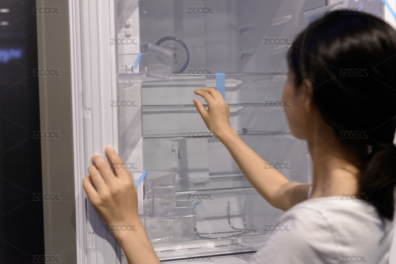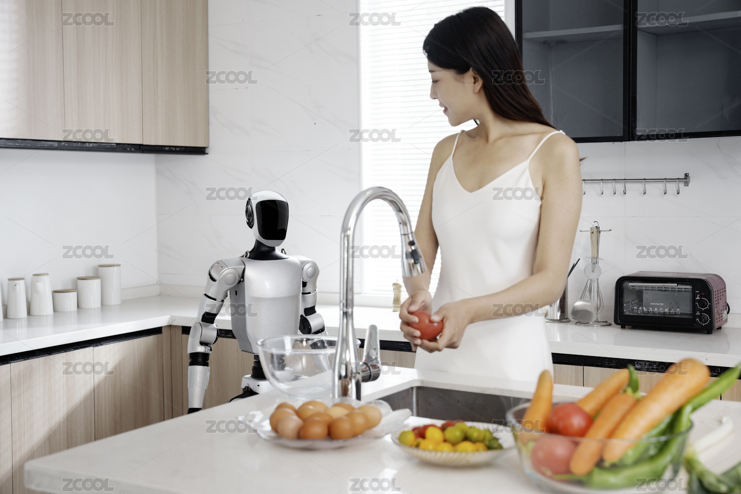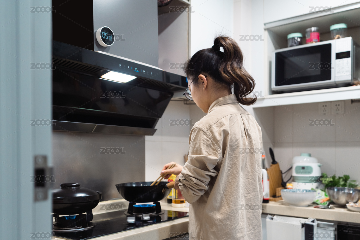 年轻女性拿着水杯站在餐桌旁边看向前方