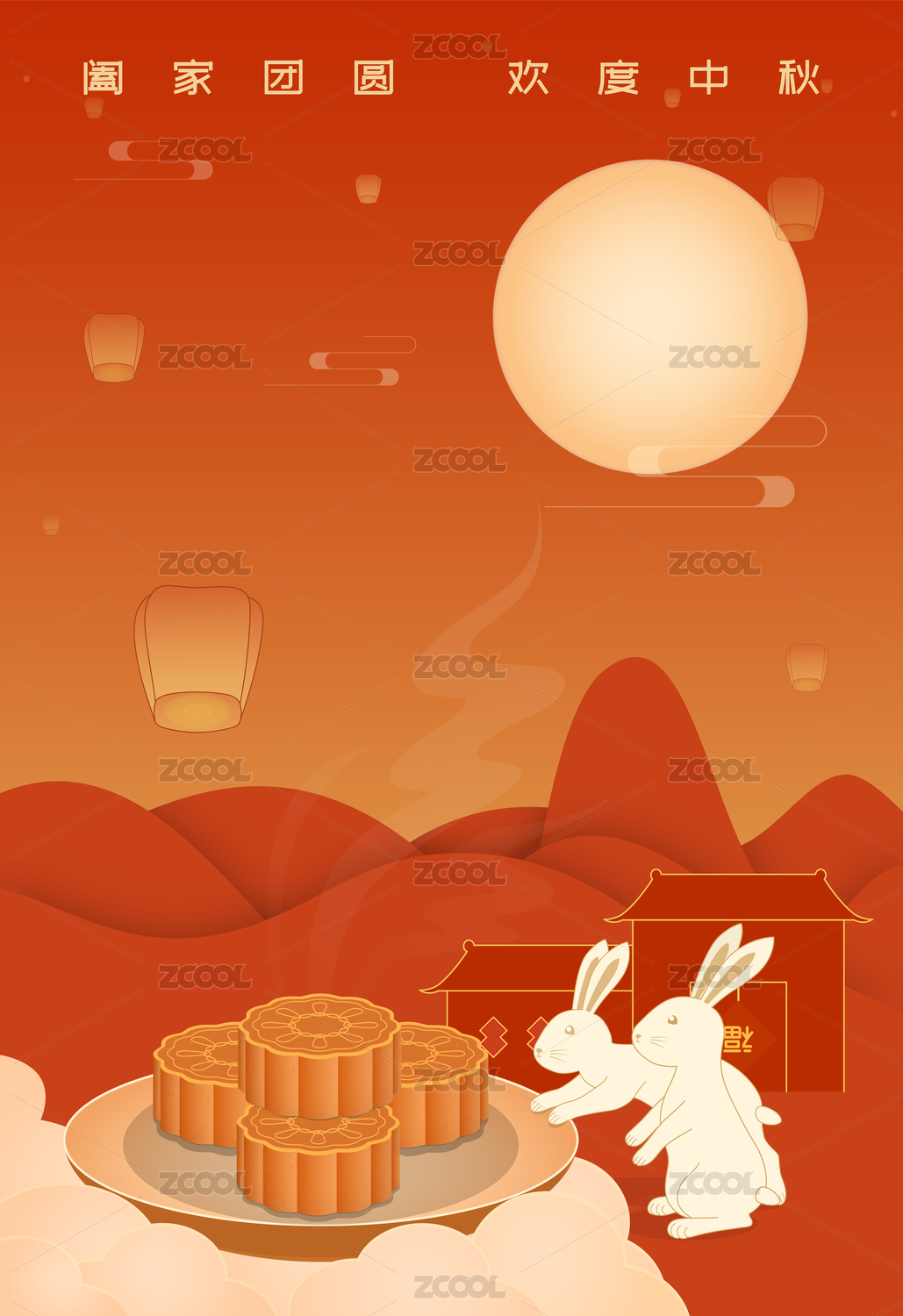 中秋节新中式剪纸风圆月白兔月饼竖版有字