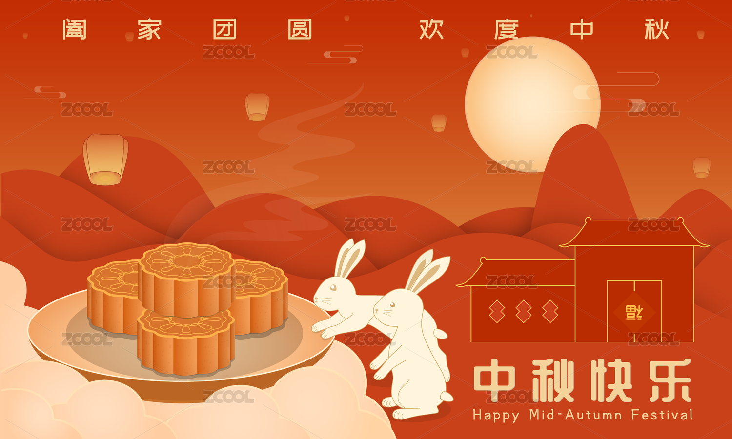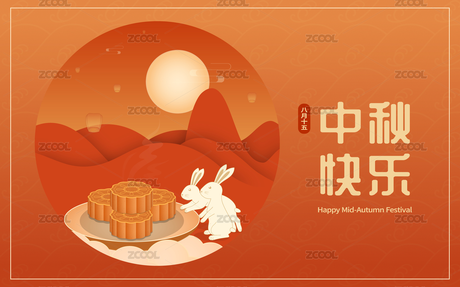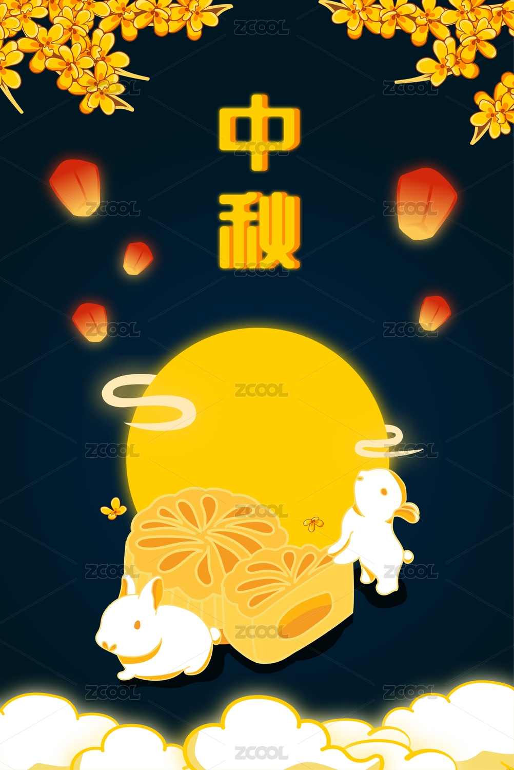 中秋节站在月饼上的兔子和月亮桂花等