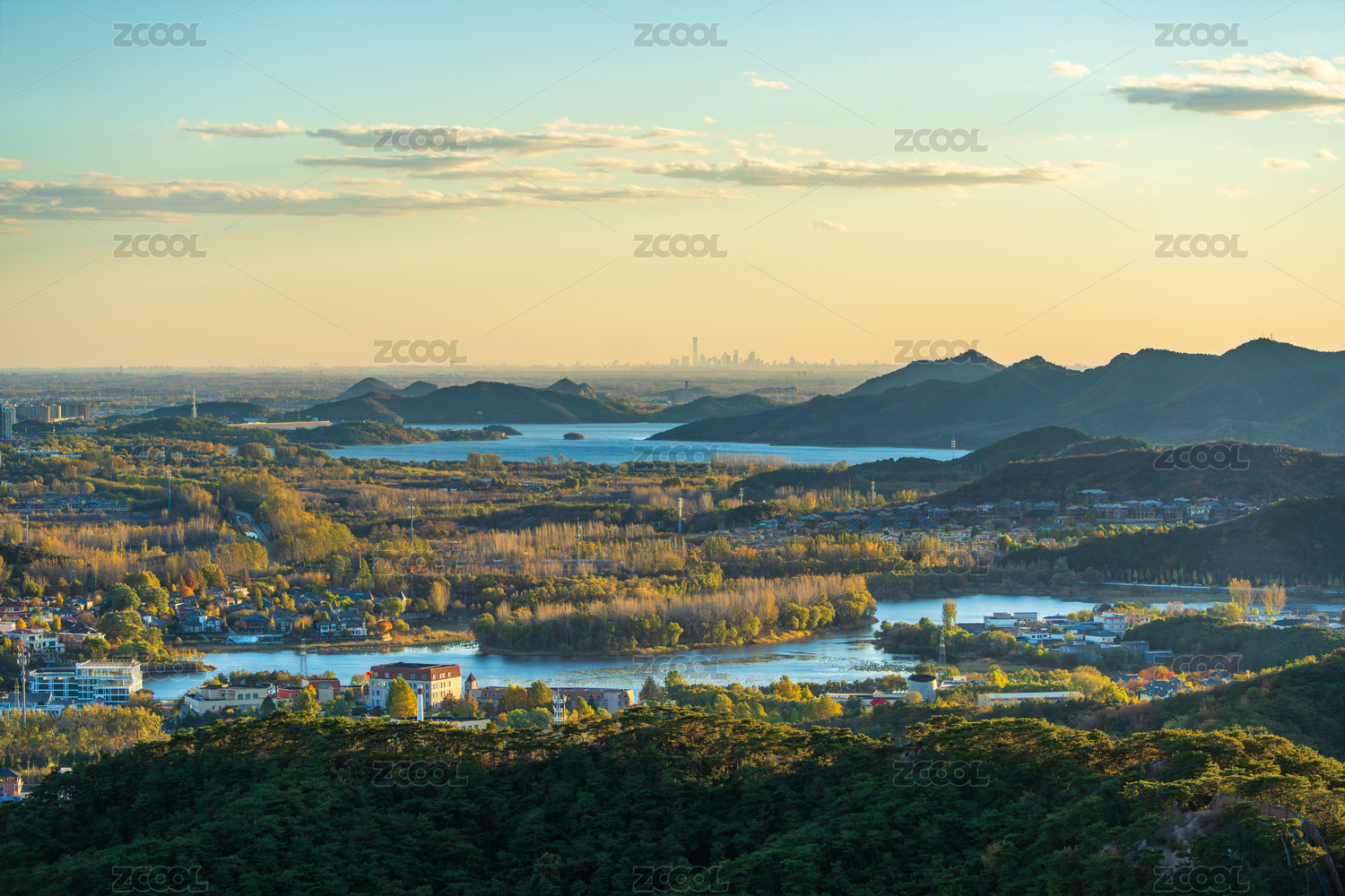 春天北京八大处公园视角长焦俯瞰城区及寺庙
