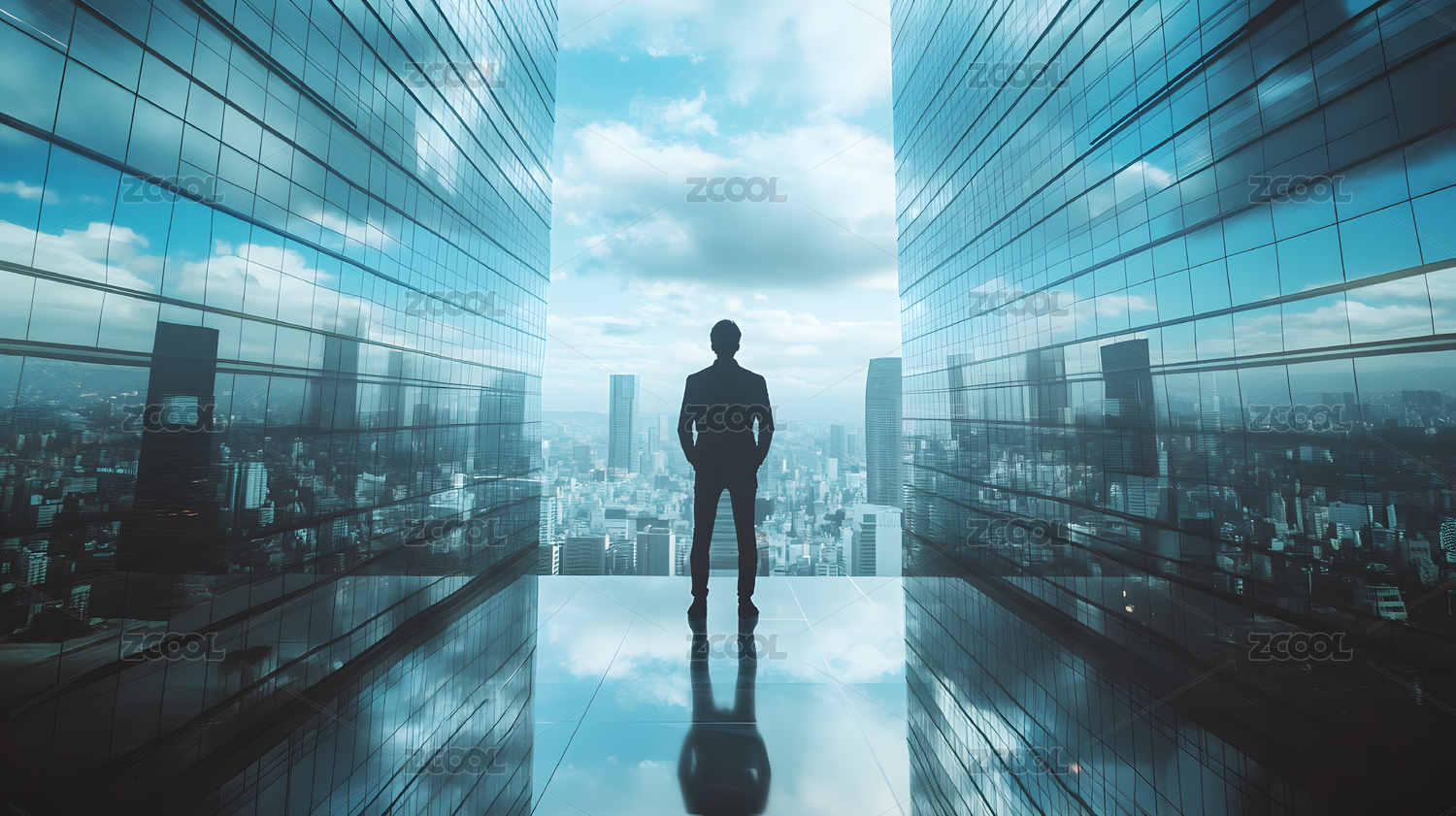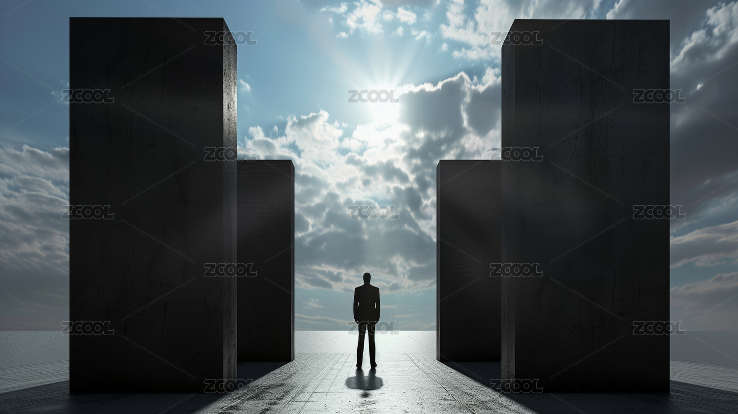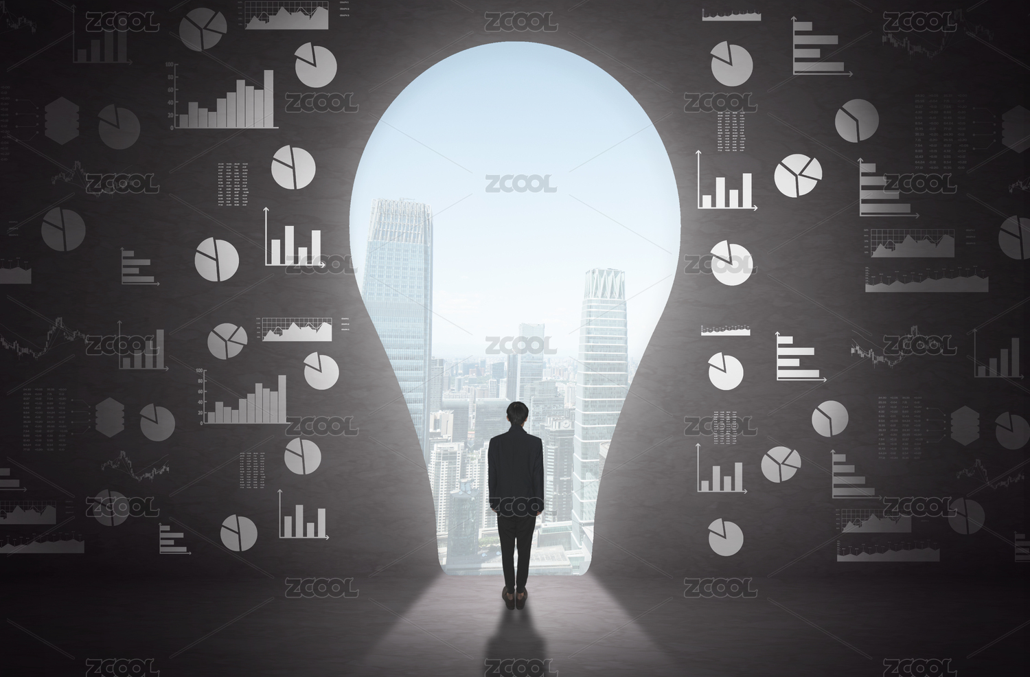商务人士站在逆光希望成功之门前思考理财投资金融经济商业概念背影
