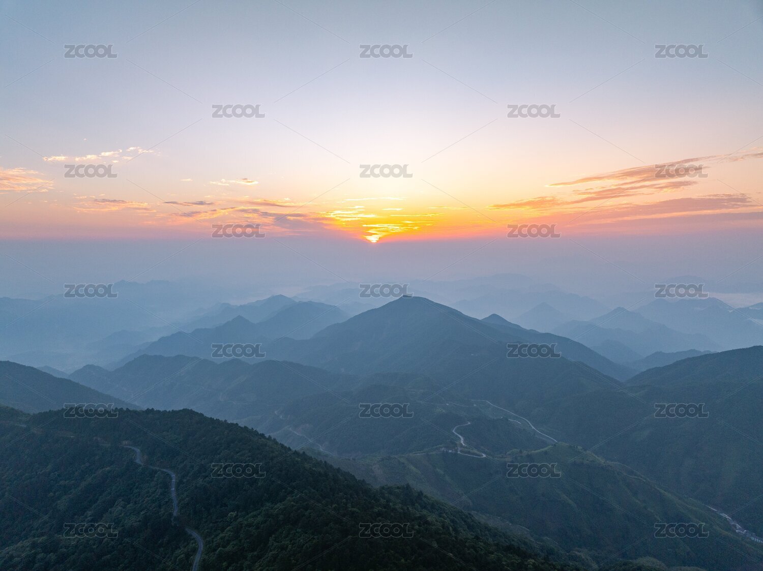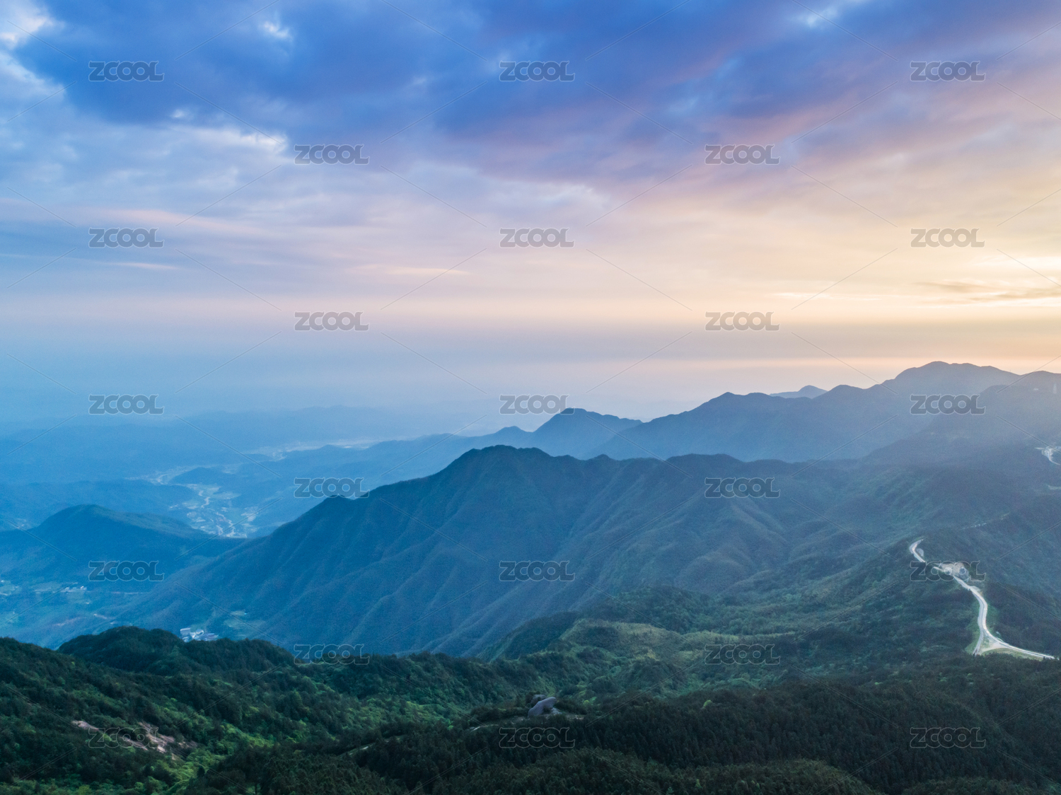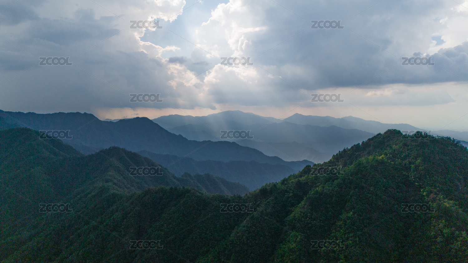 蓝天白云下远处山峦云遮雾绕近处山峦起伏间高压输电线横穿其中