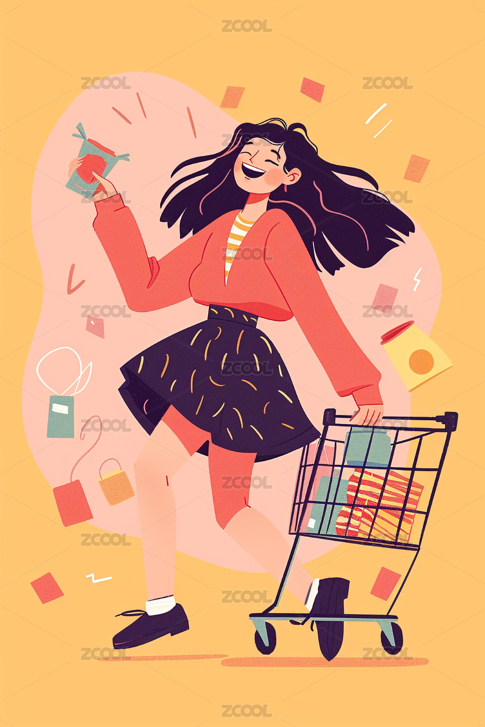 在购物节推着购物车的时尚卷发女孩插画