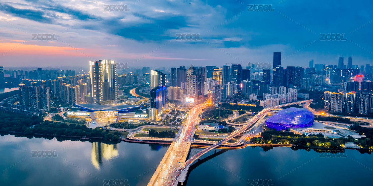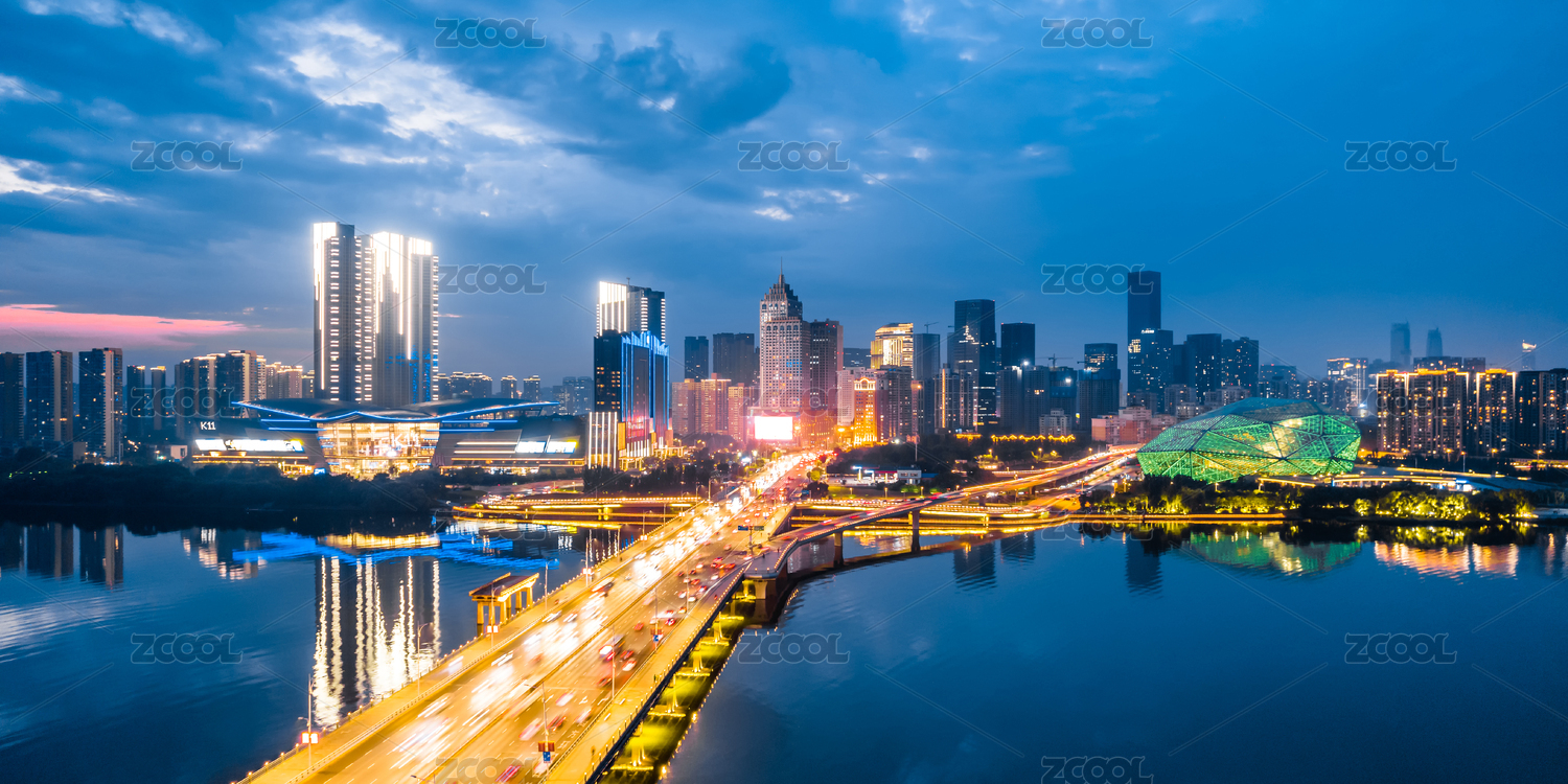 中国辽宁浑河大桥现代建筑夜景航拍图