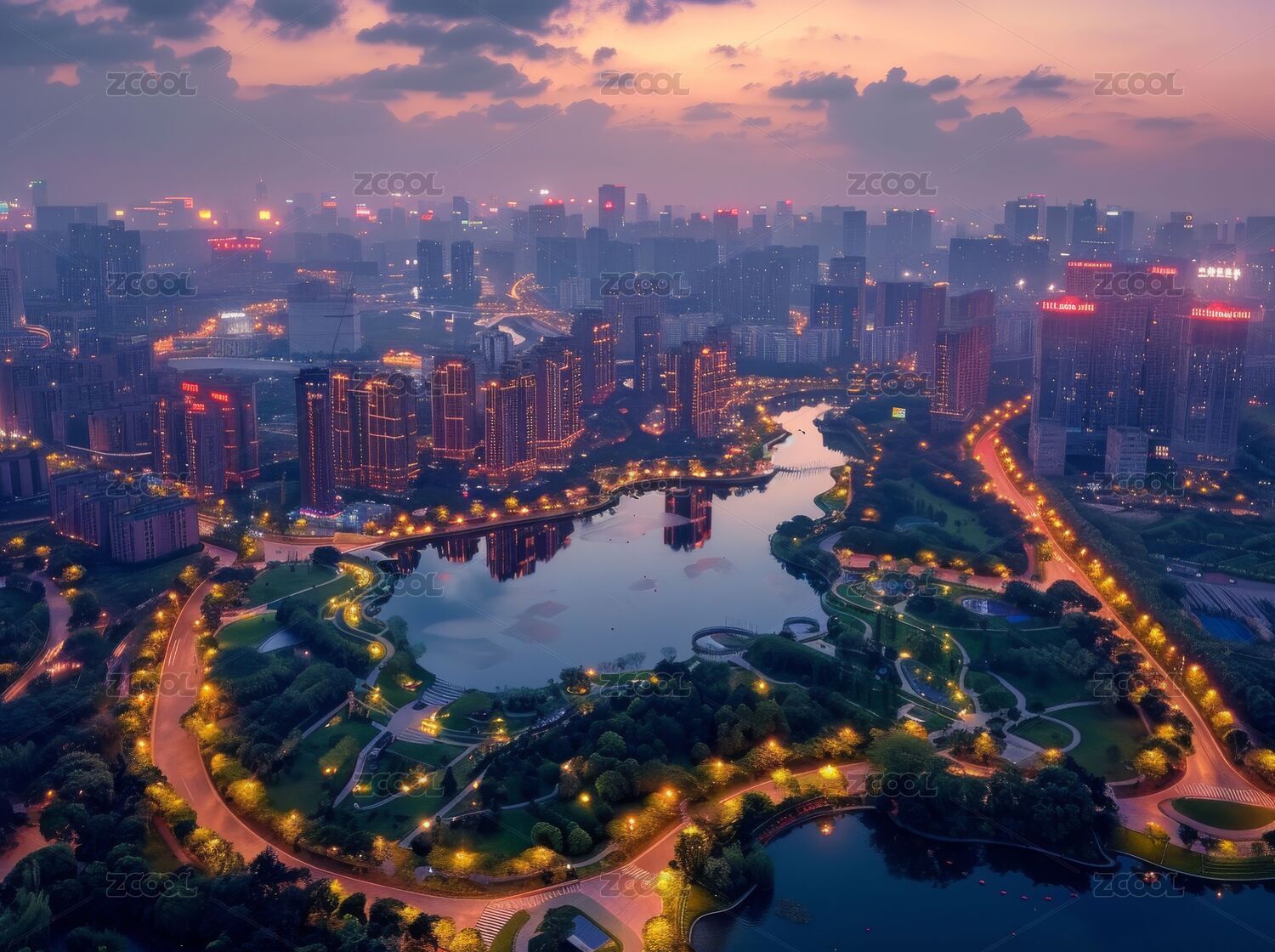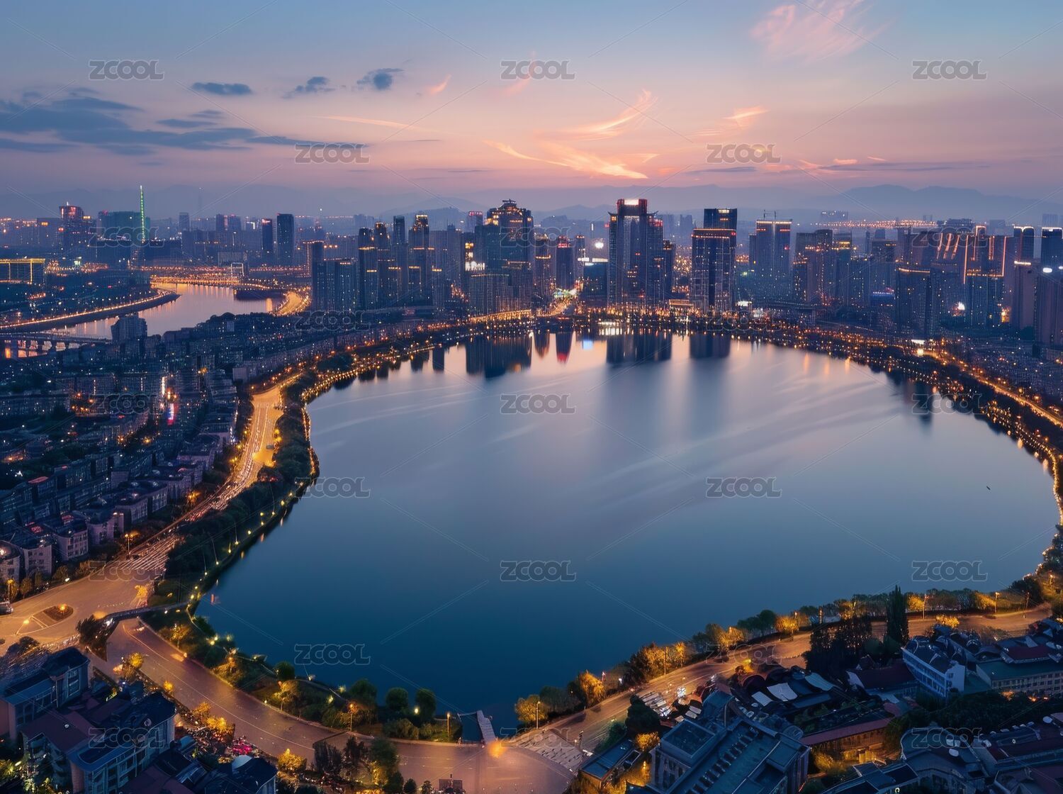 湖泊现代城市建筑大楼繁荣夜景高清广告海报