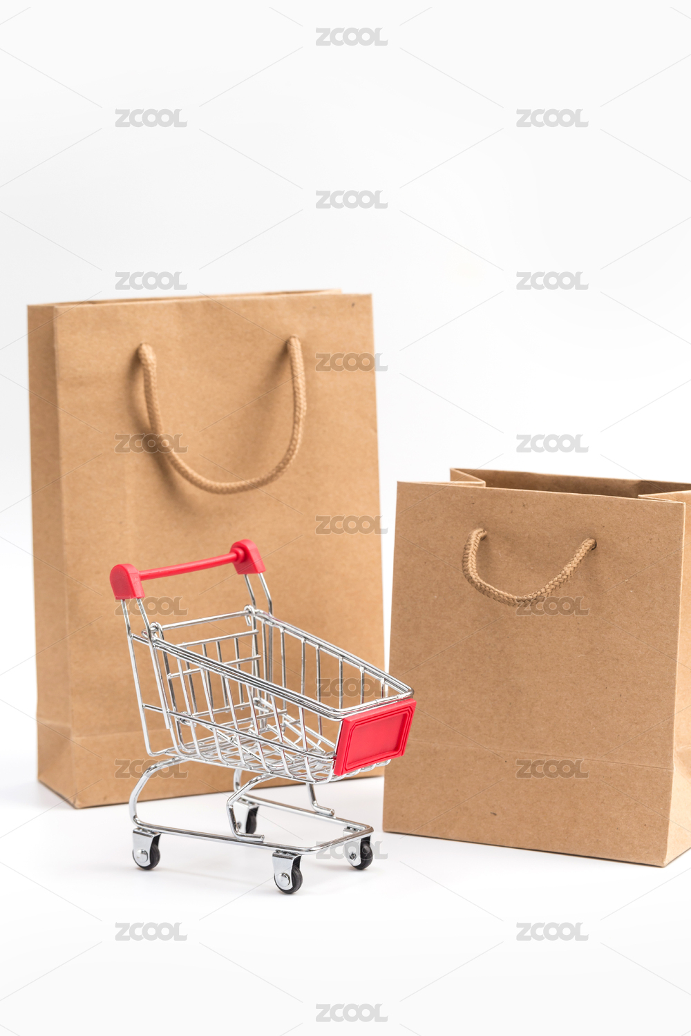 白背景上的购物车和牛皮纸购物袋消费网购概念图