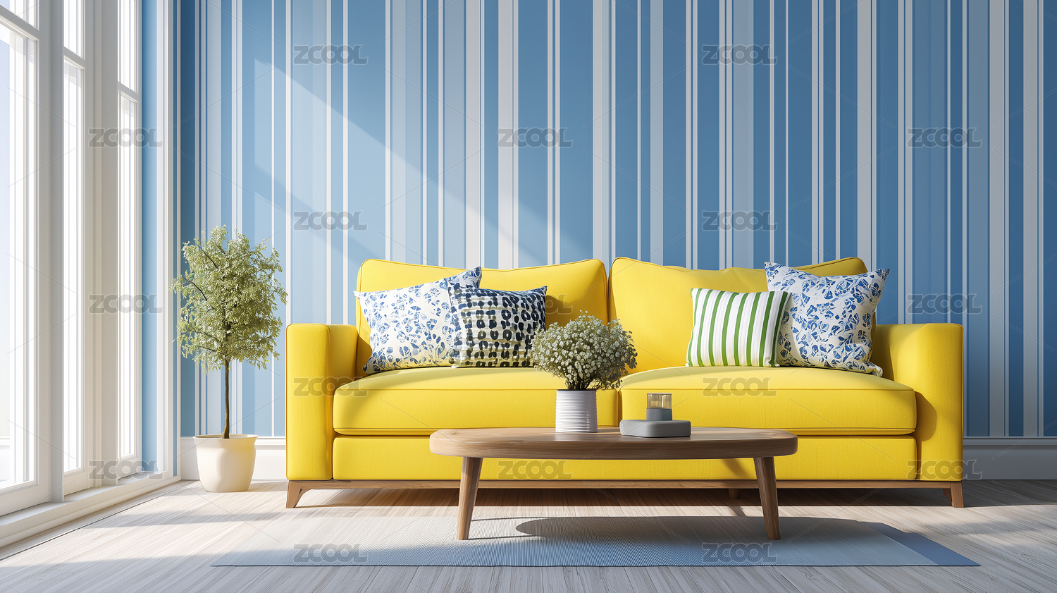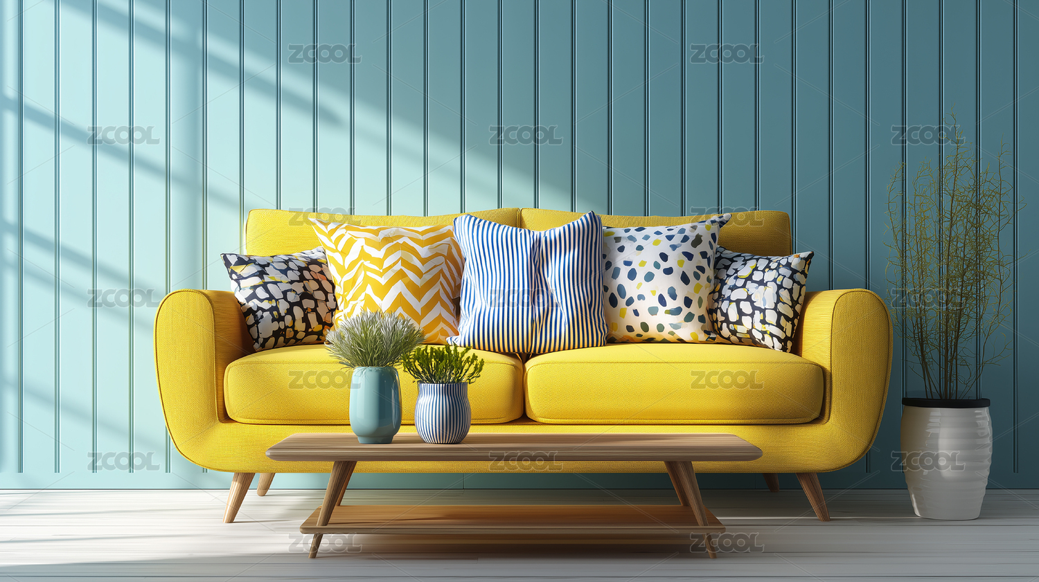 现代客厅的黄色和蓝色装饰