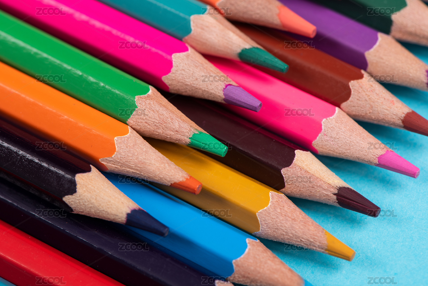 整齐排列的彩色铅笔笔头特写,蓝色背景