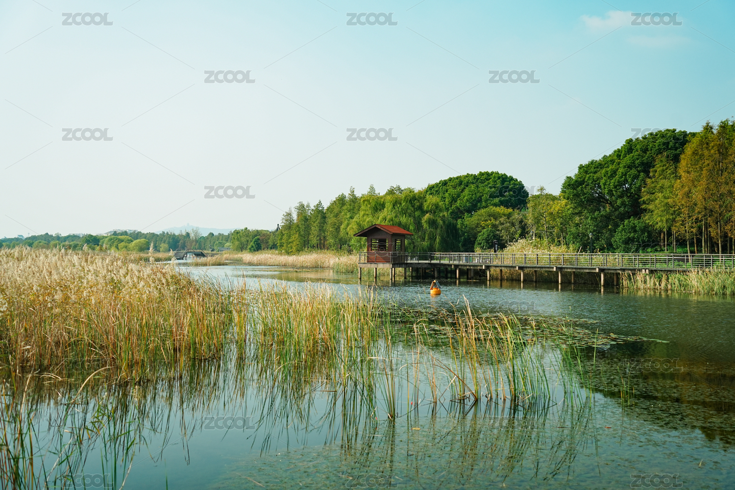 天津官港森林公园里的野鸭观鸟休闲栅栏步道
