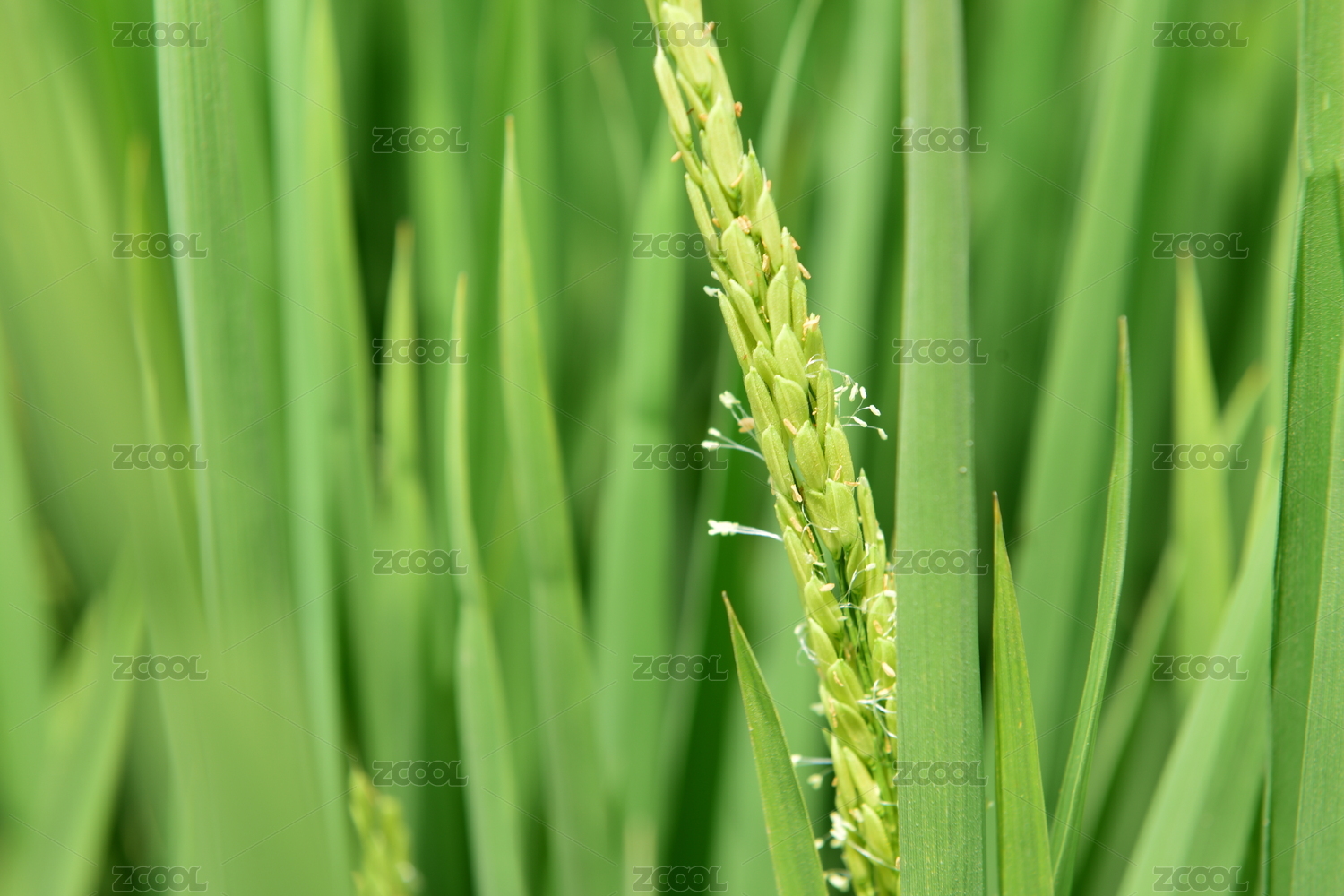 农田里刚刚开始灌浆的稻穗特写