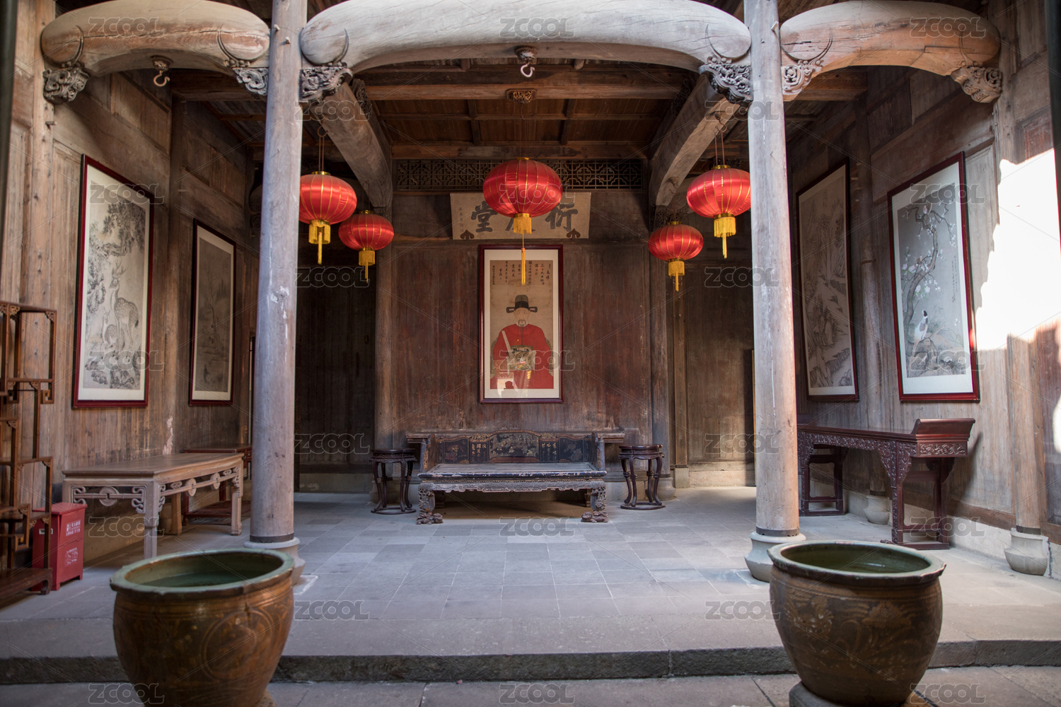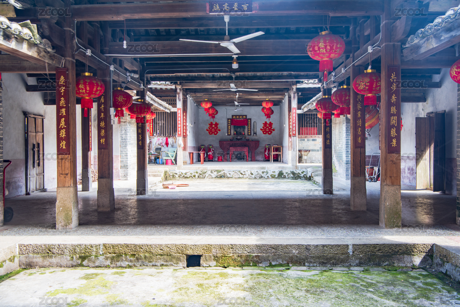 古堡内部木制结构的房间建筑与中央天井,中国福建连城