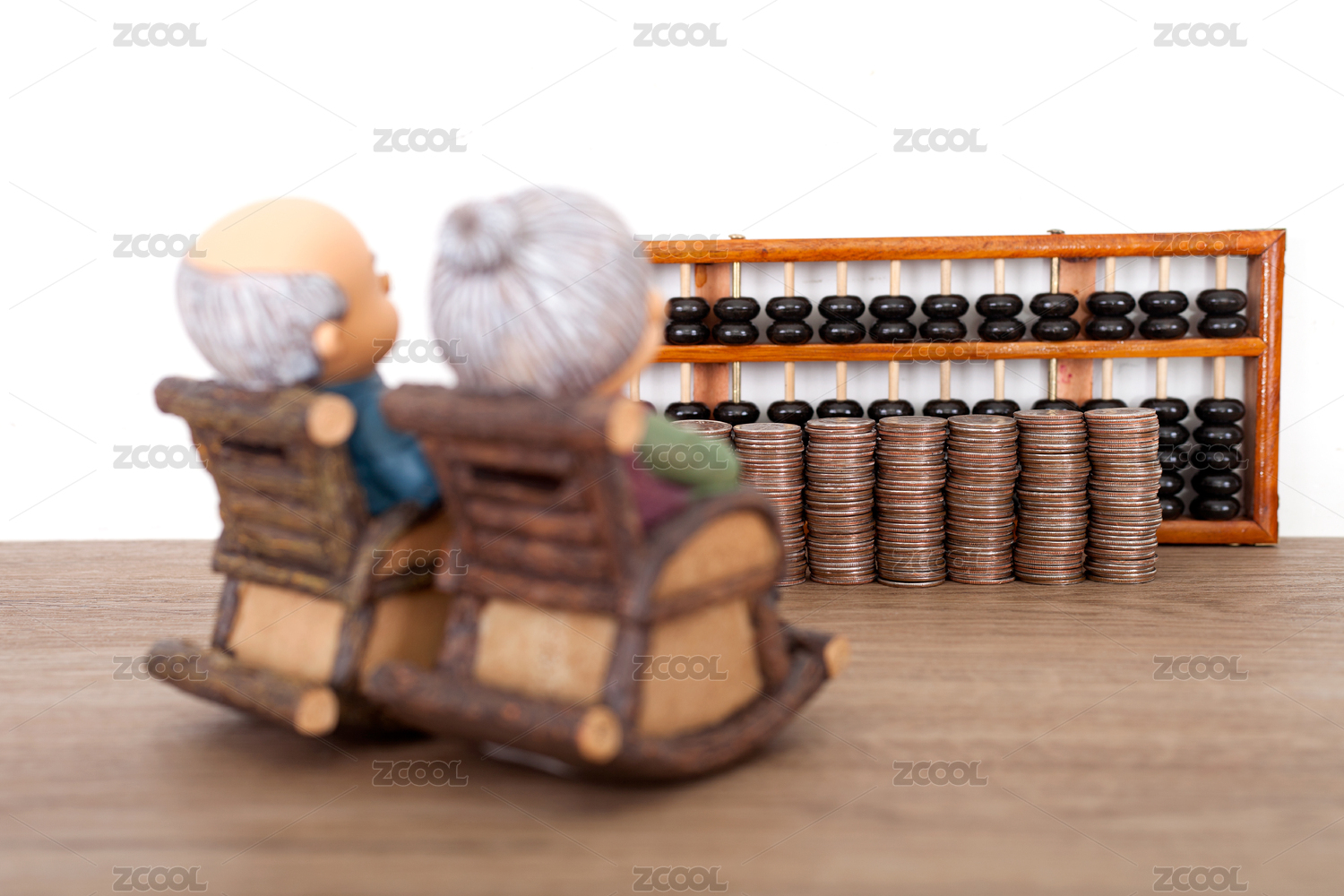 老爷爷模型和老奶奶模型面对着一排美元硬币和算盘计算工具