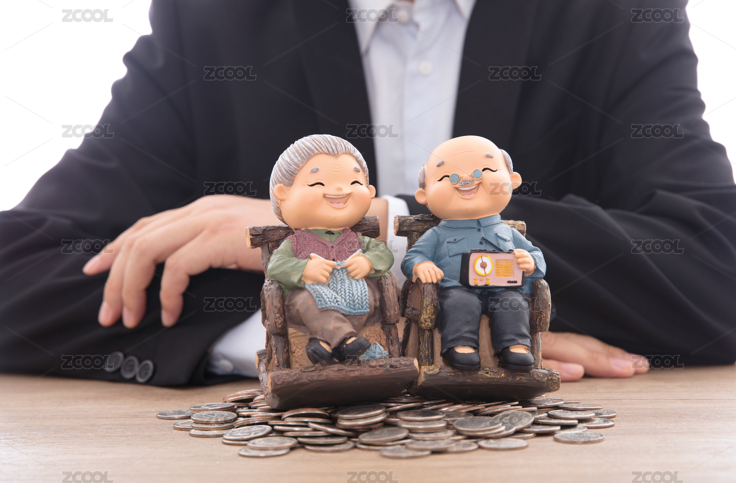 穿着正装的男性双手呵护着放在美元硬币上的老两口模型