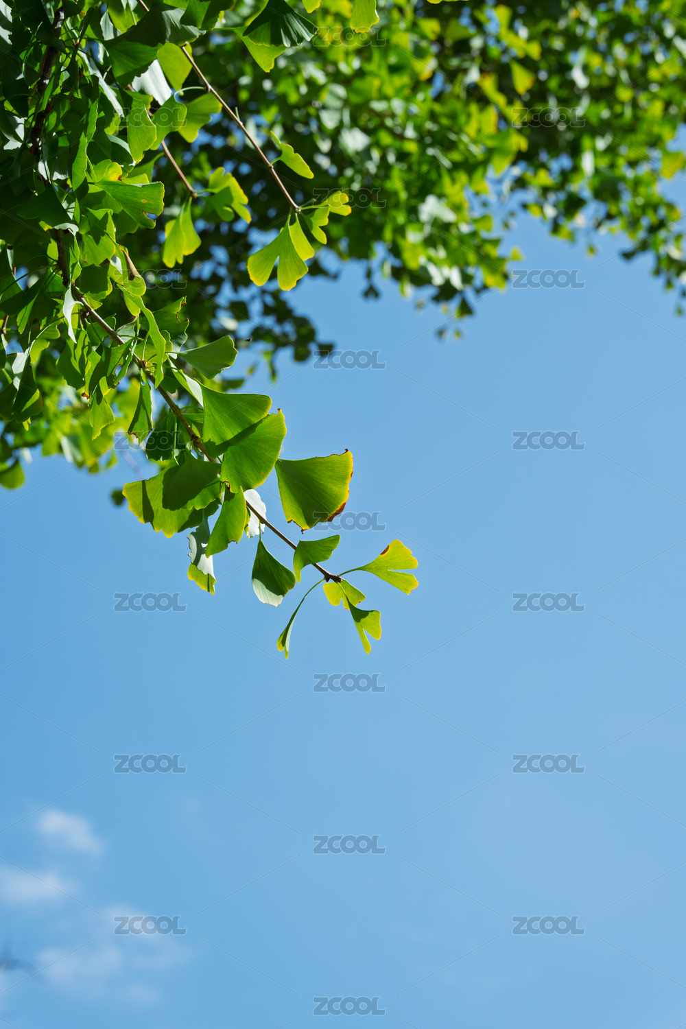 蓝天下透着阳光的绿色银杏叶子