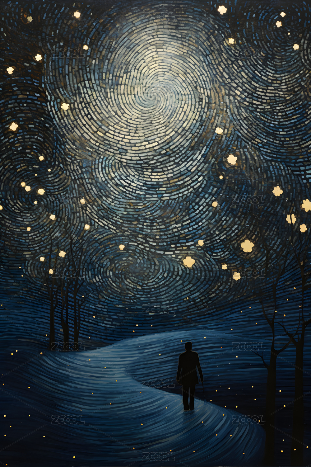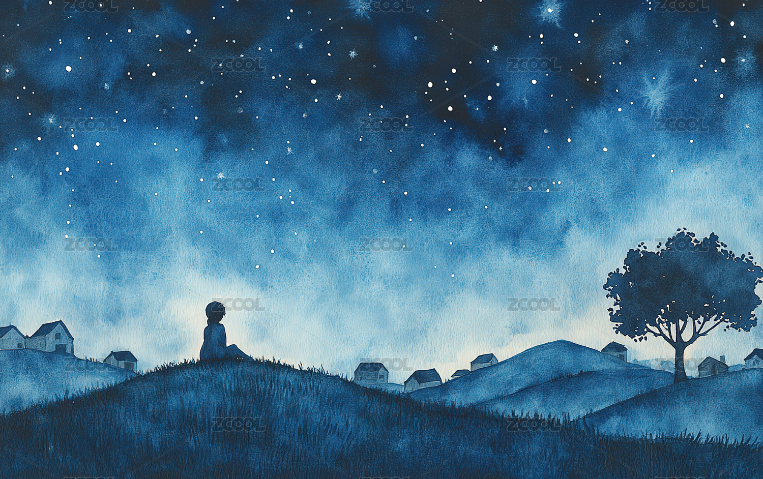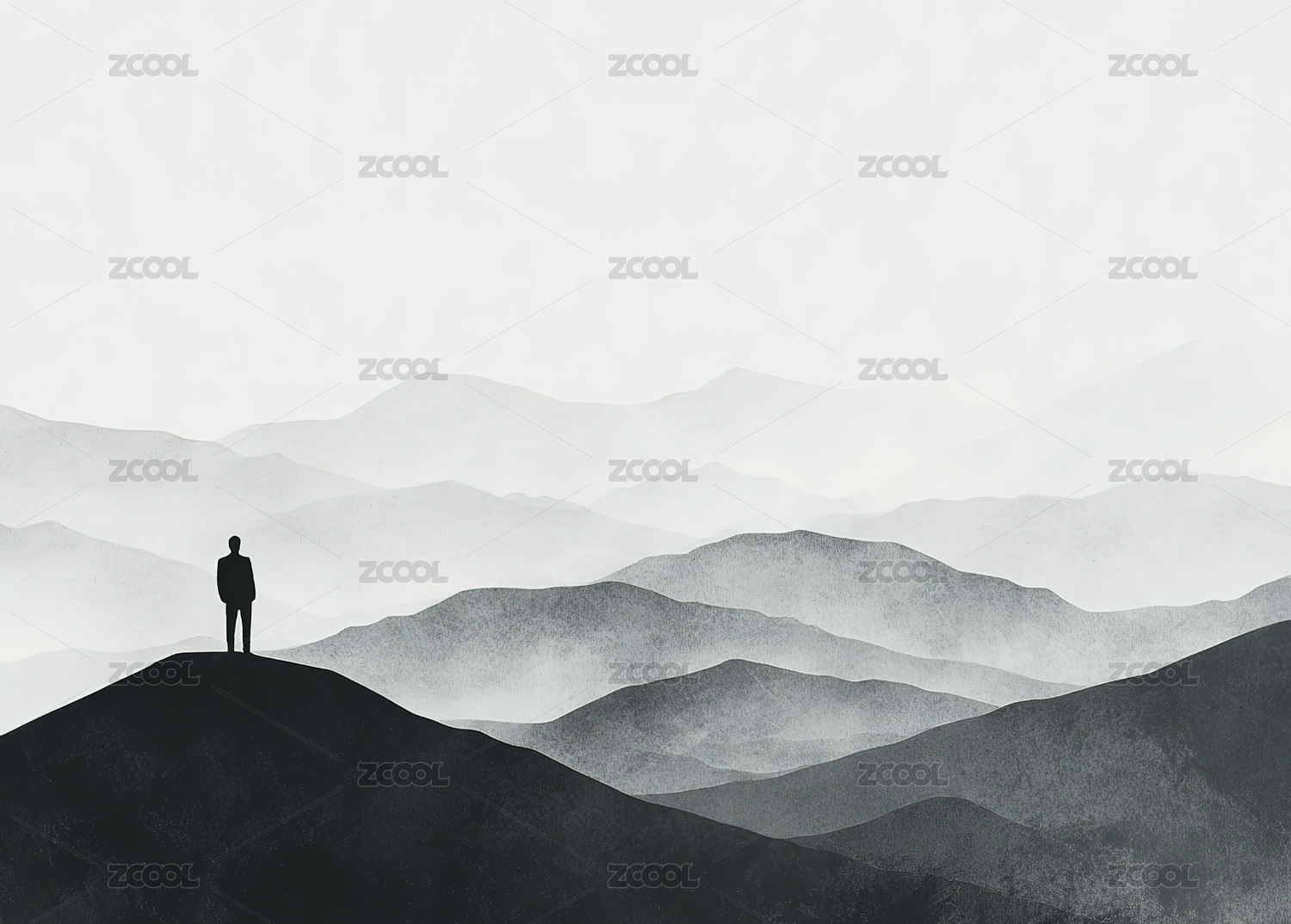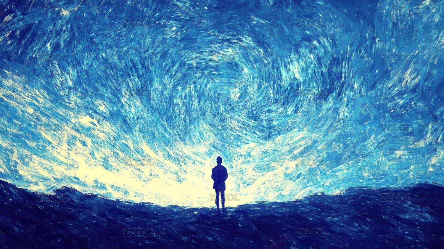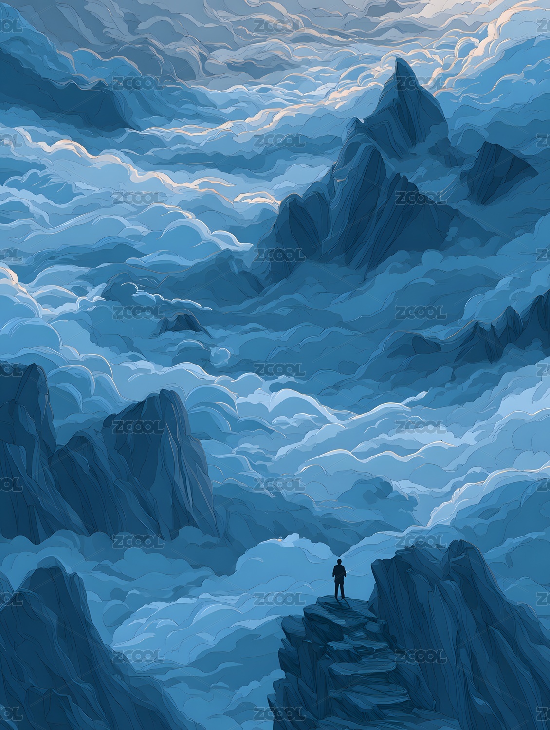 蓝色云海环绕高山人物伫立的梦幻意境插画