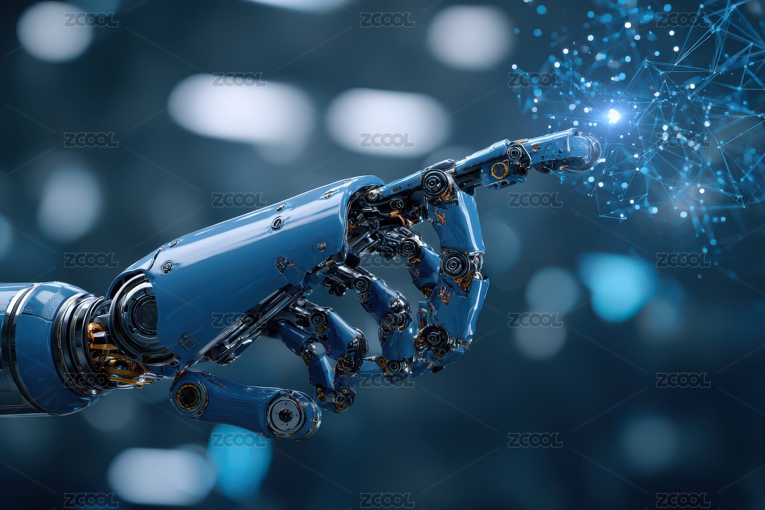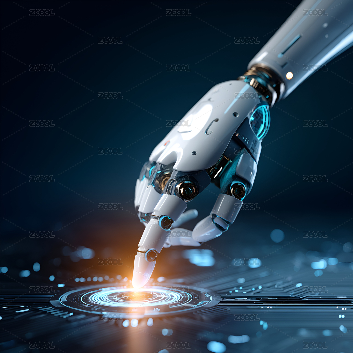 机器人手触碰电路板上的蓝色光芒
