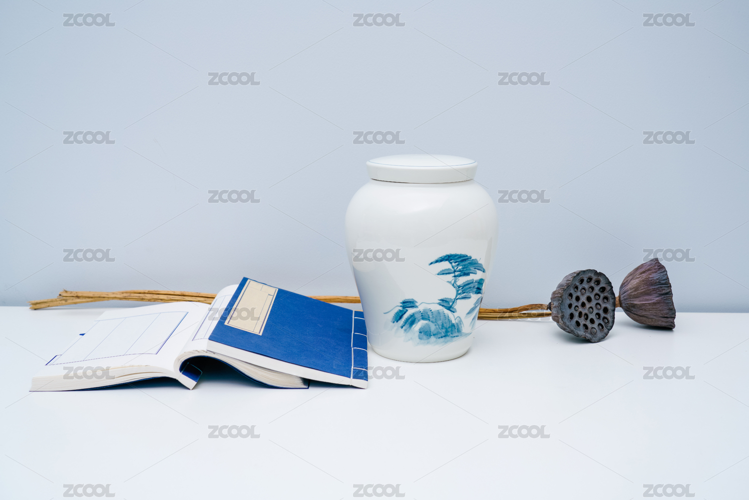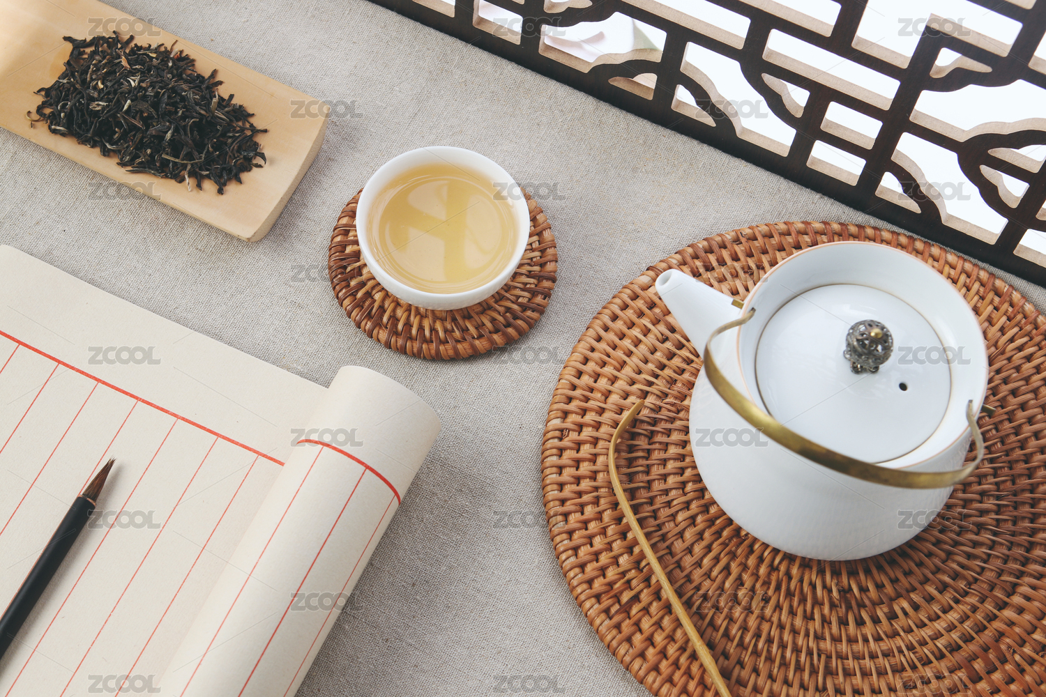 茶杯,盖碗,线装书和毛笔放在书桌上