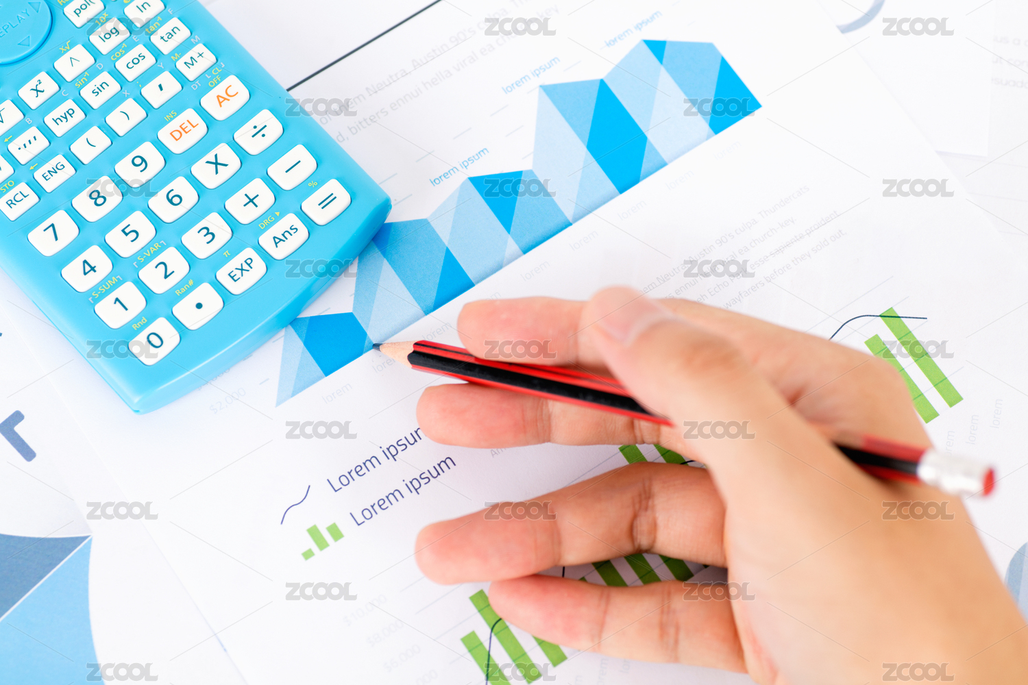 手里拿着笔在放有计算器和平板电脑的图表上分析数据