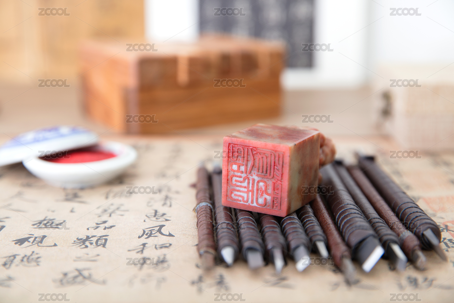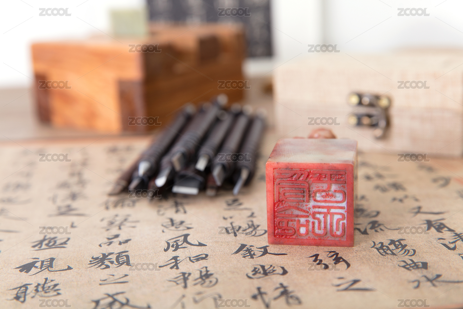 书法背景上一枚印章和一把刻刀