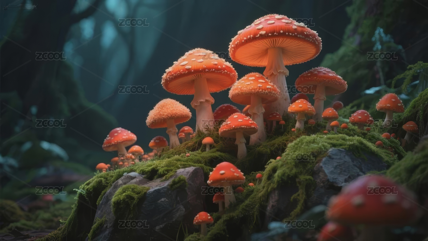 幽暗森林中的蘑菇群