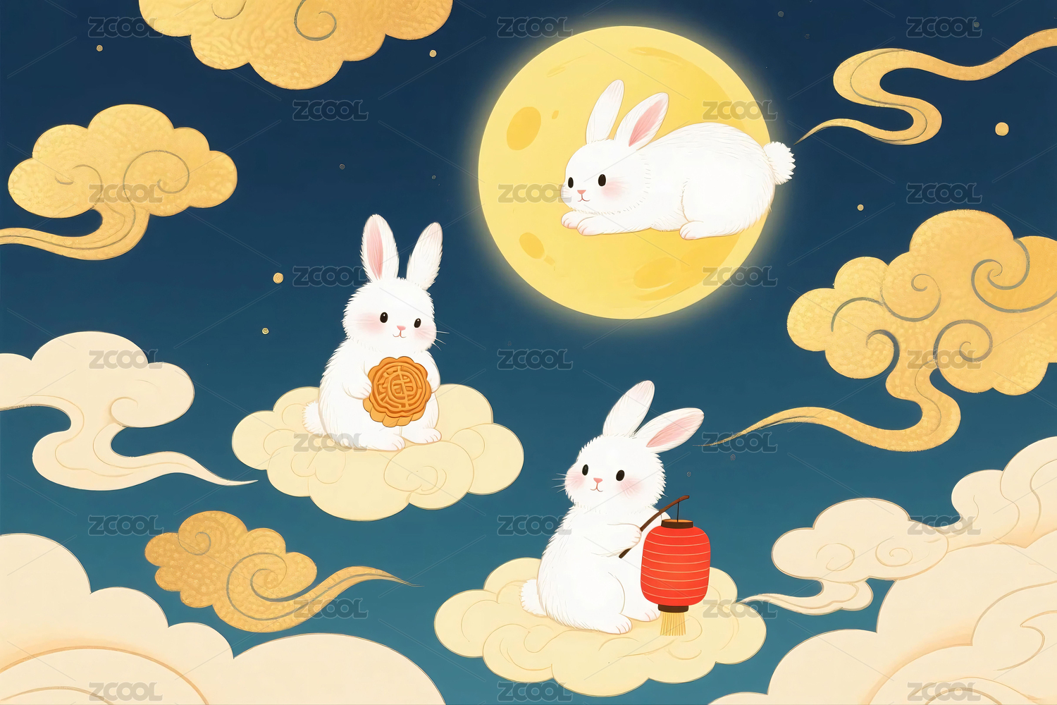 圆月和兔子国风插画