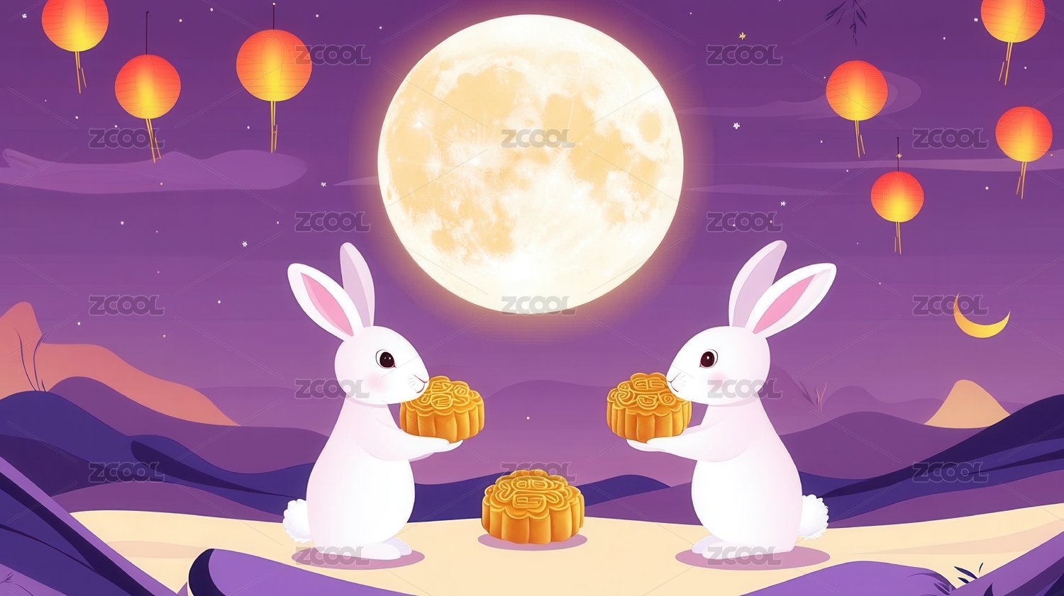 中秋圆月孔明灯和兔子横幅插画