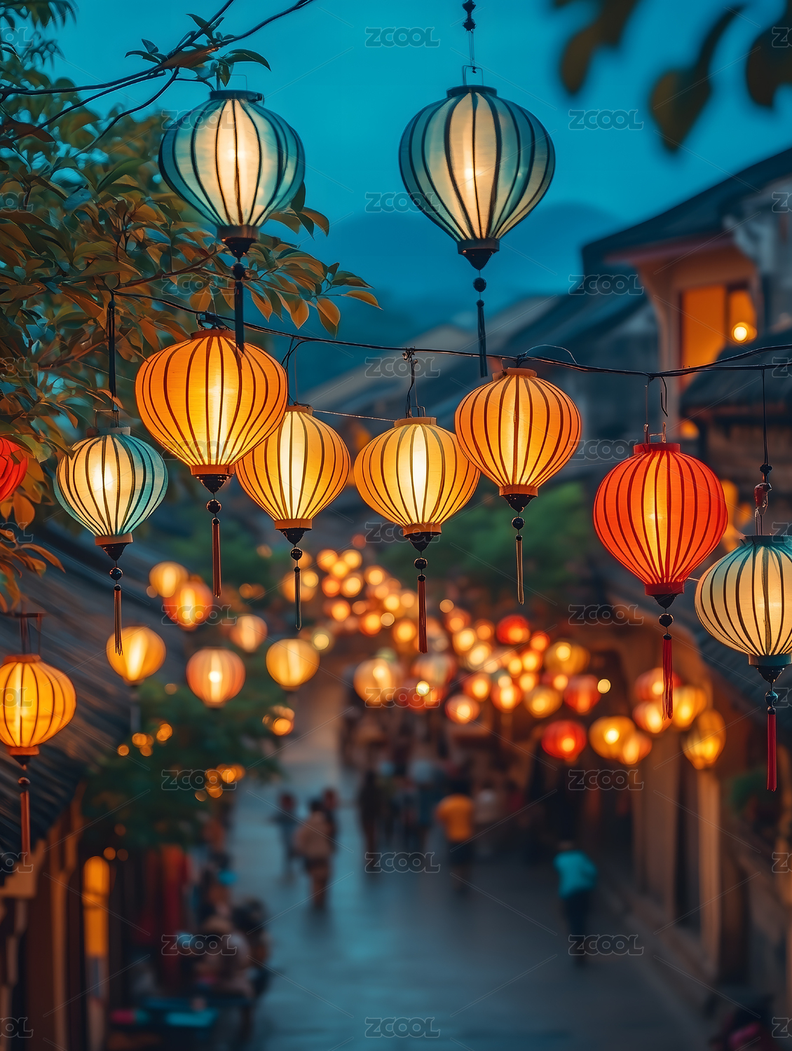 挂在中国苏州黎里古镇烟雨廊道上的灯笼