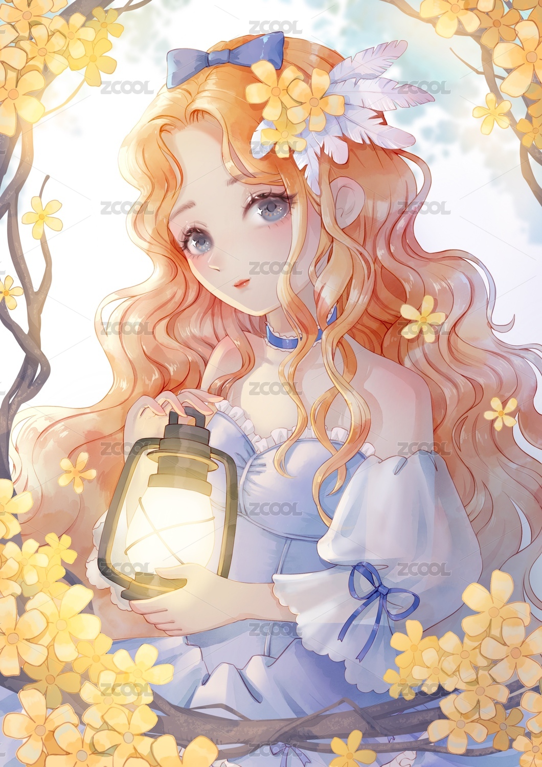 唯美浪漫二次元紫色金发小花拿着灯的女孩
