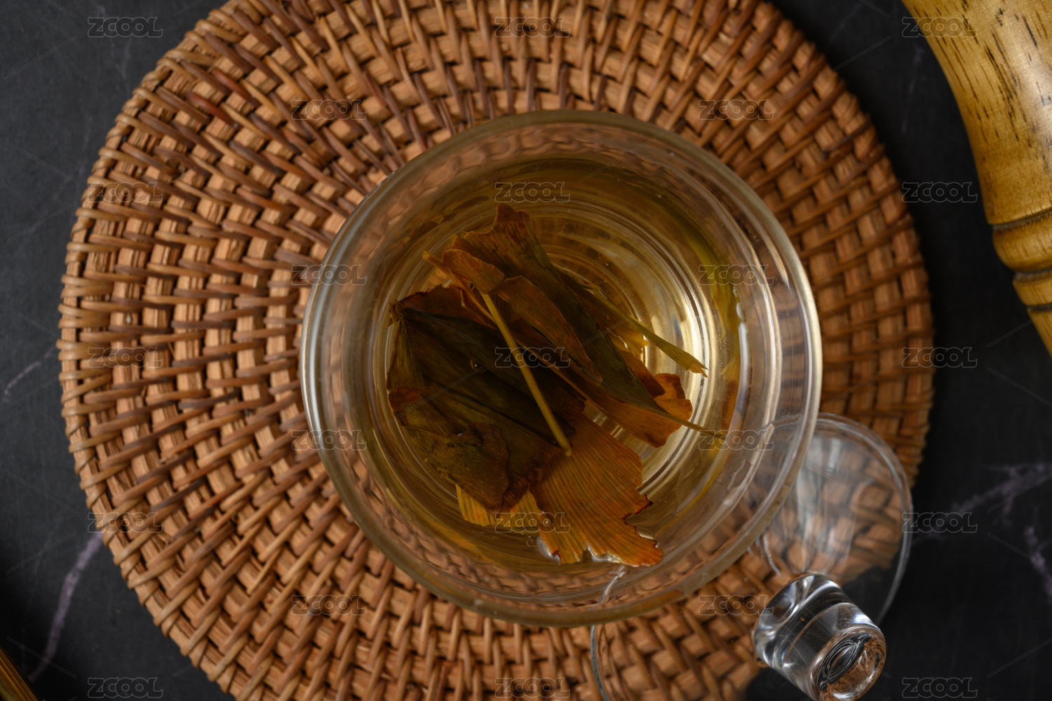 桌面上的盘子里的甘甜可口的银杏叶泡水