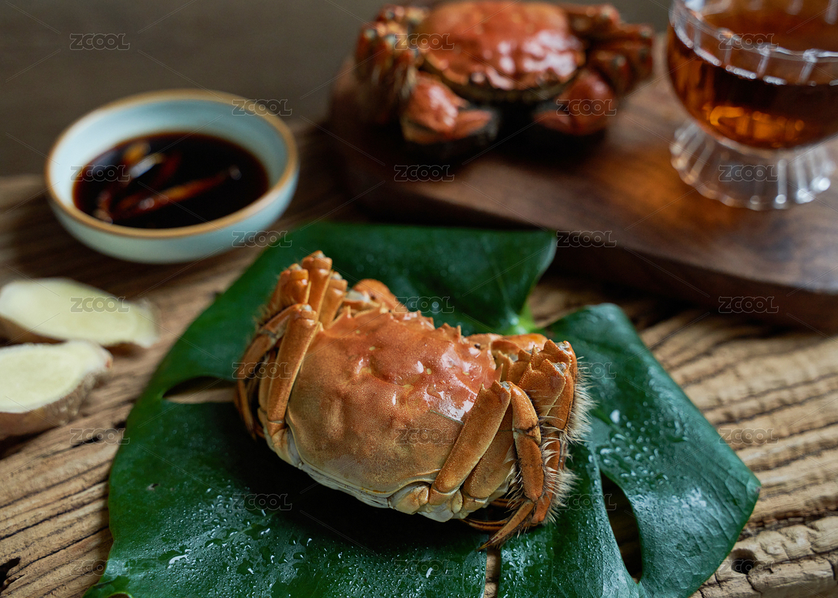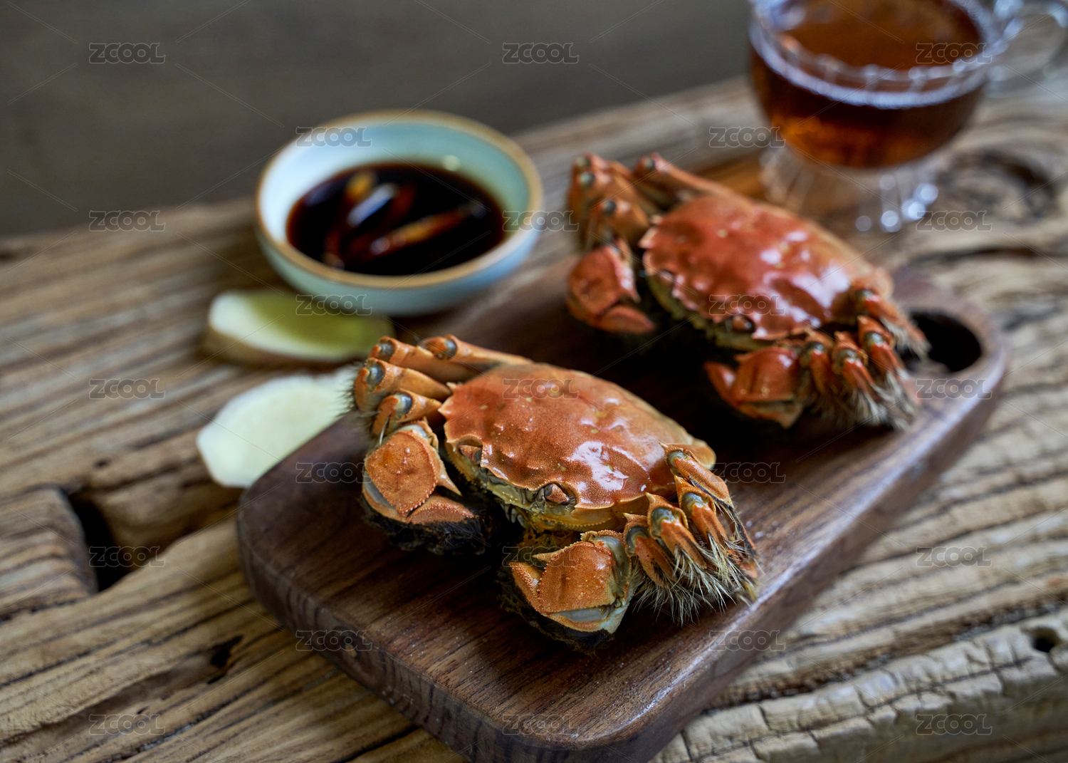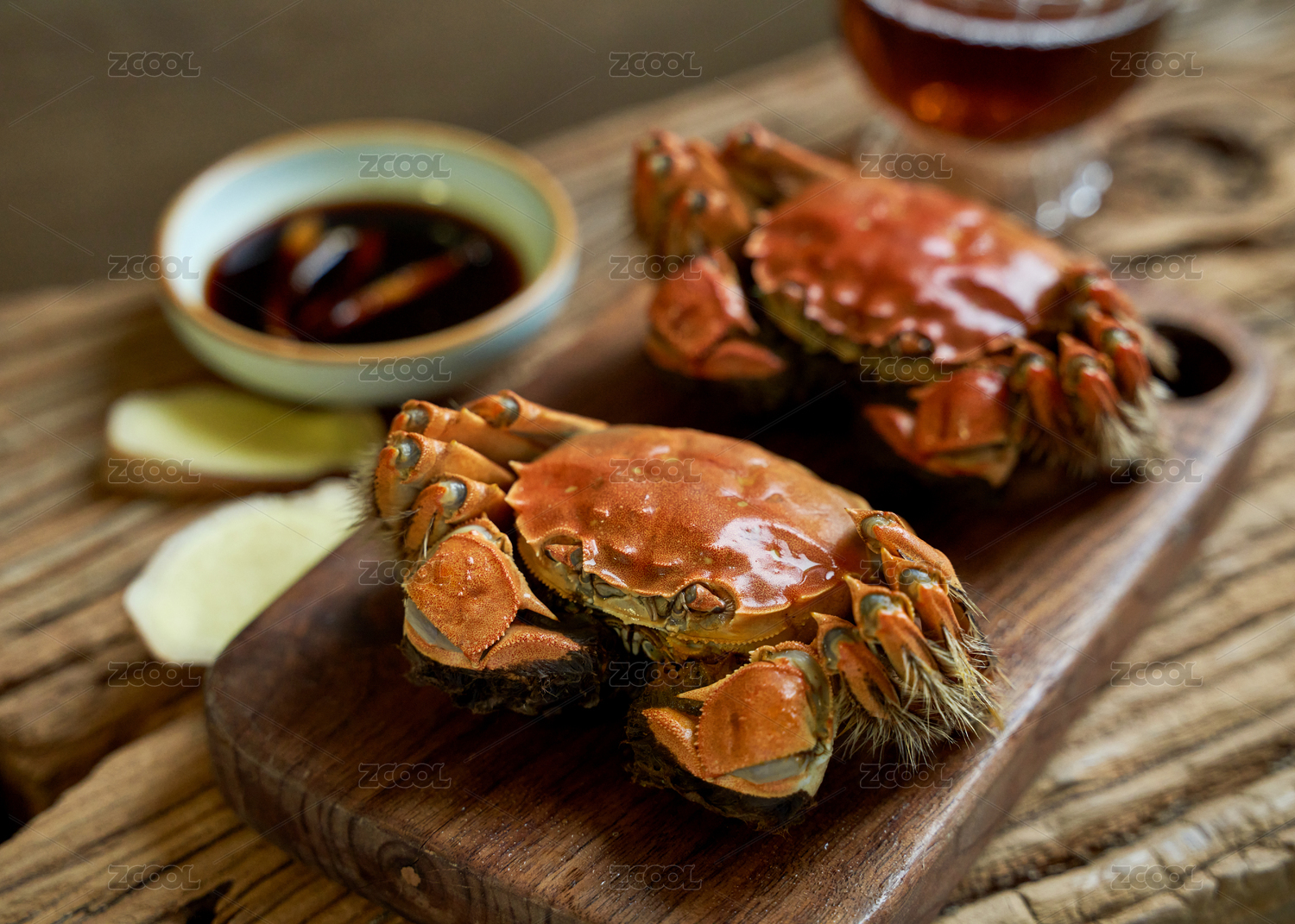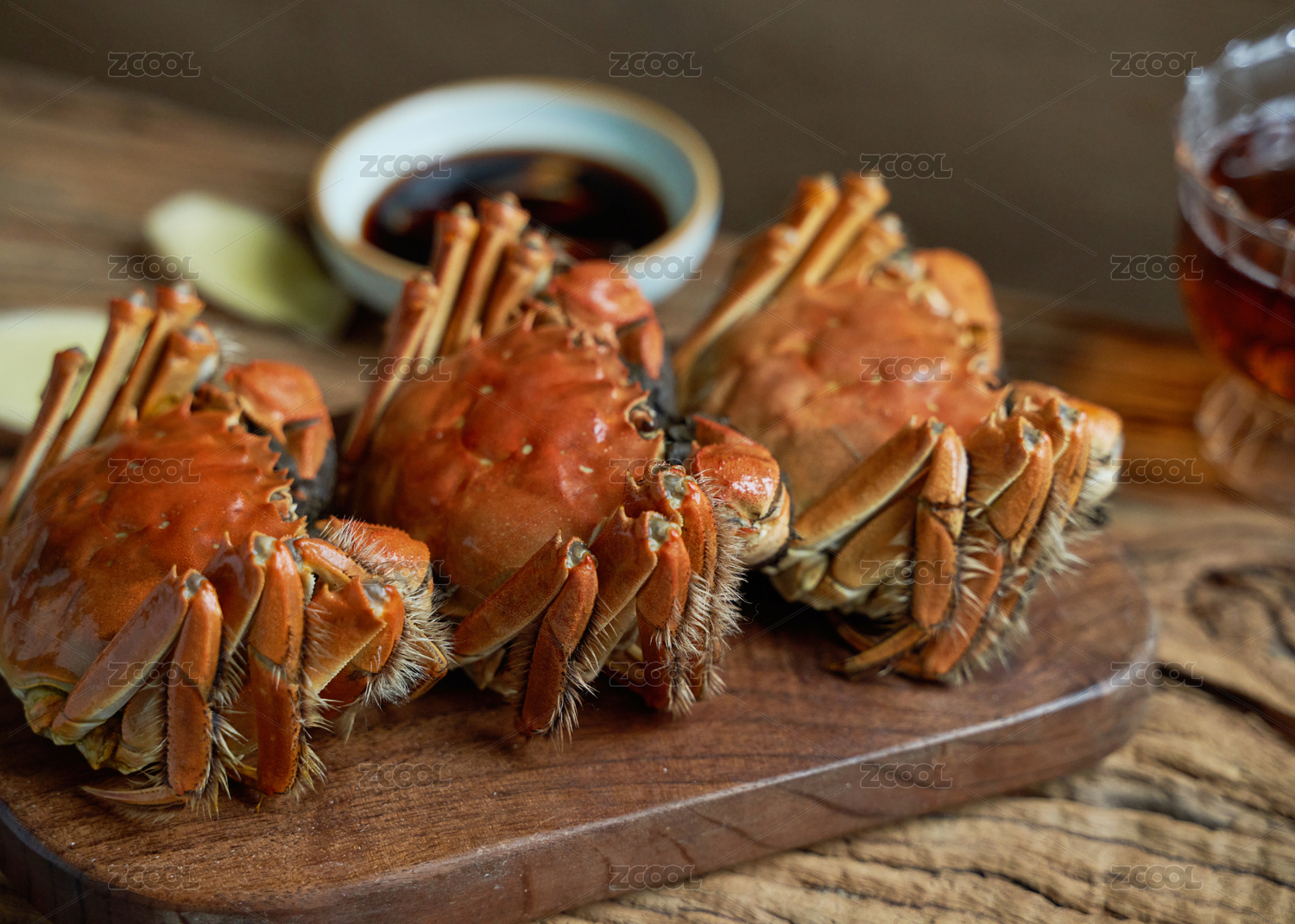 木纹背景上摆放熟的阳澄湖大闸蟹
