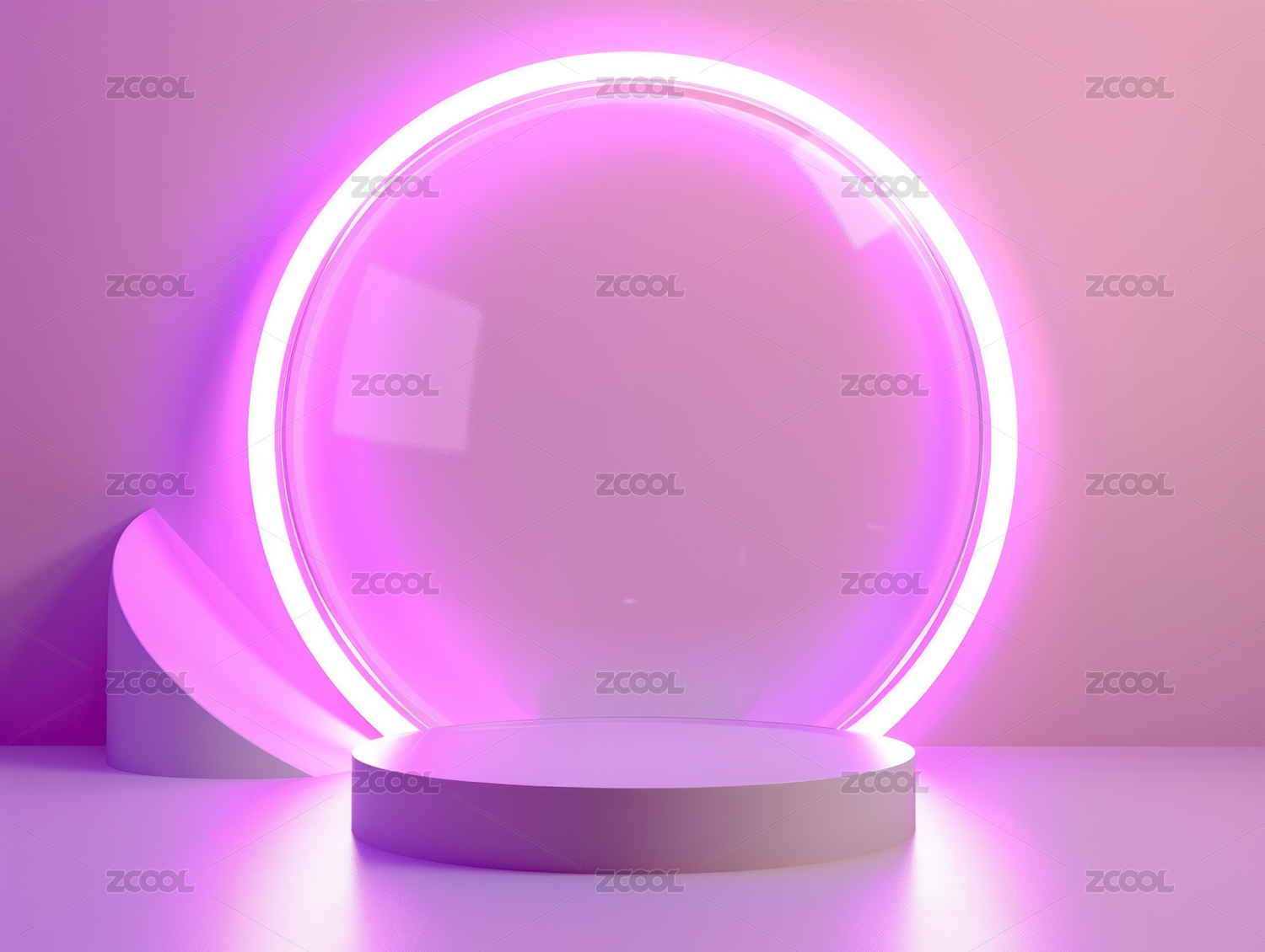 3D渲染霓虹灯带暗色圆形底座产品展台