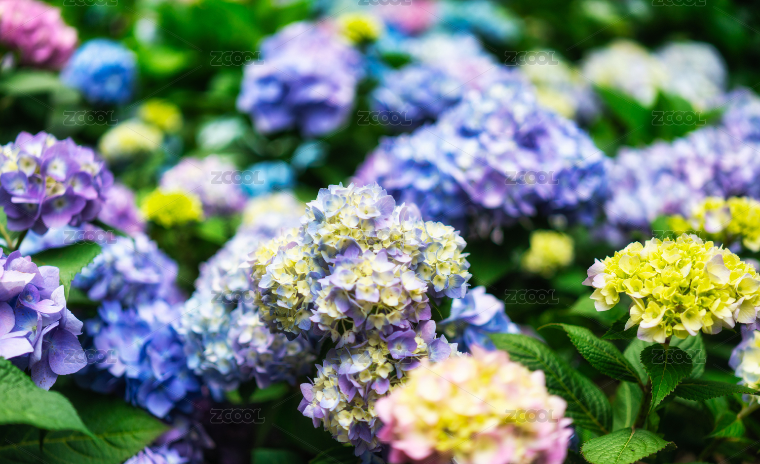 花园里盛开的各色绣球花