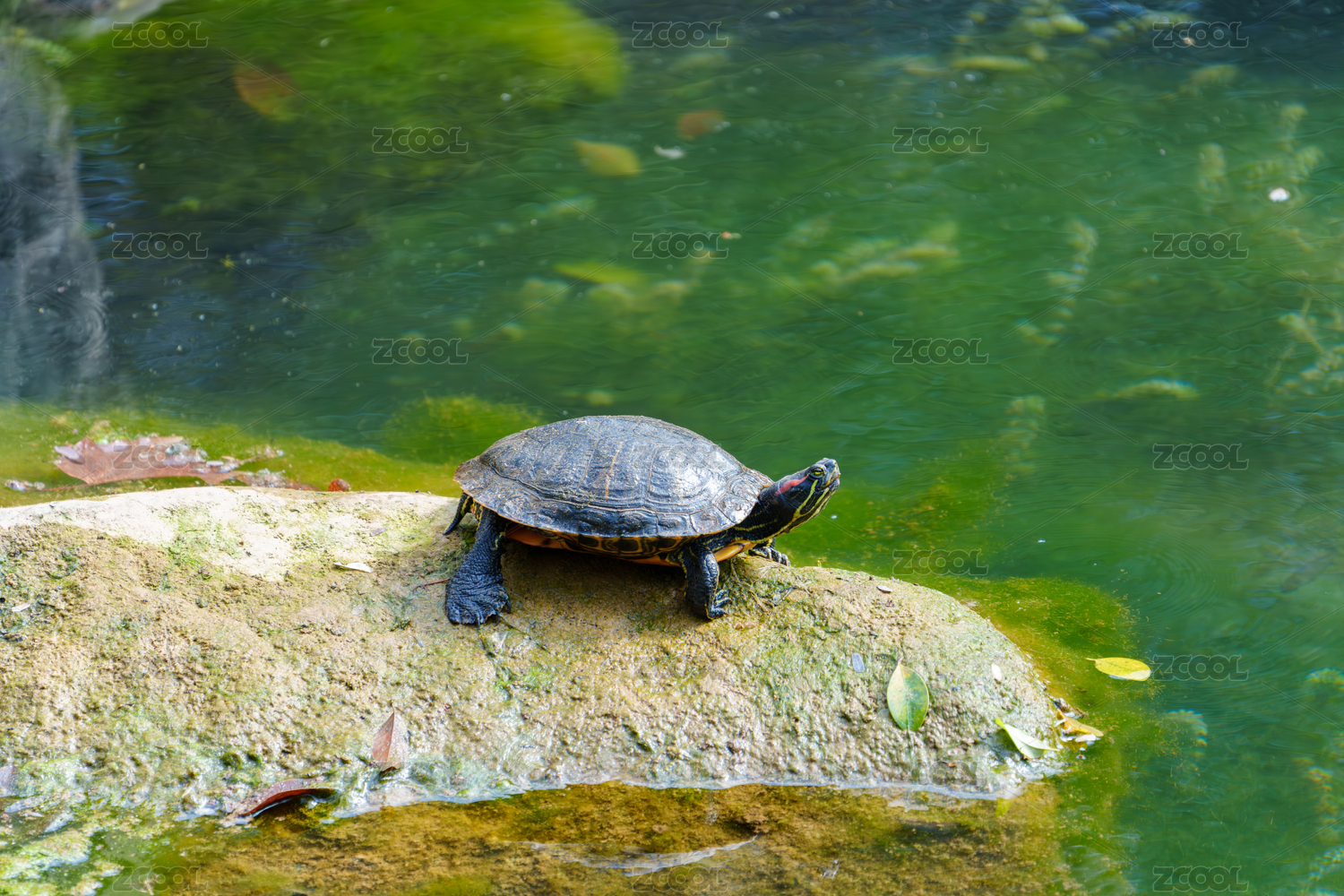 在水潭边晒太阳的成年绿色巴西龟