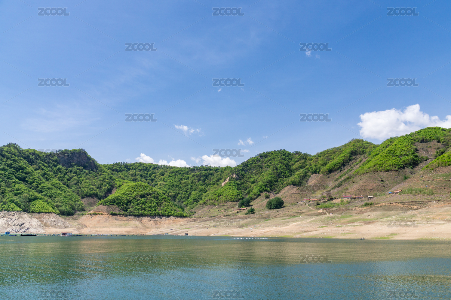 蓝天下山村湖边的山坡树林