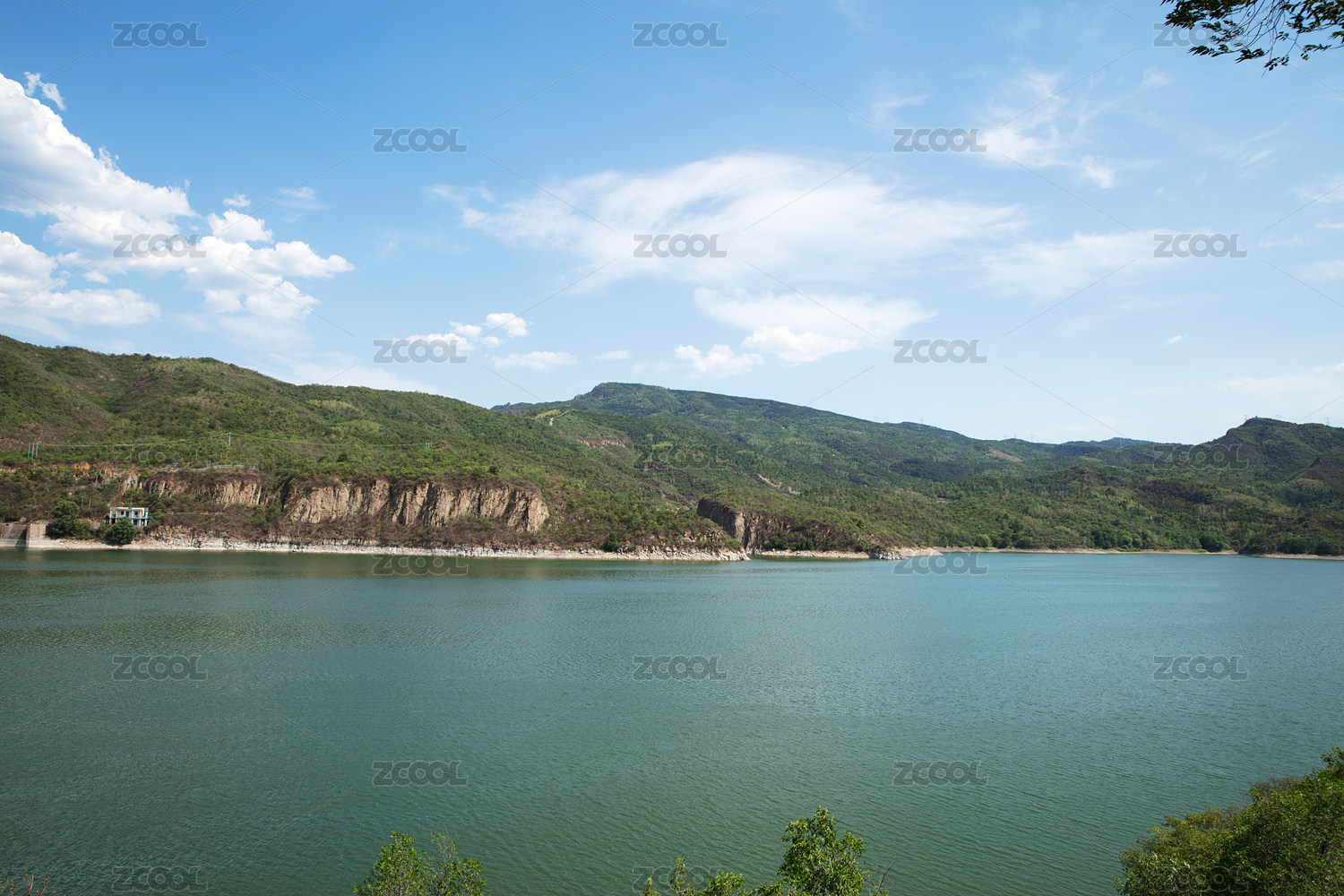 蓝天白云下的山里水库