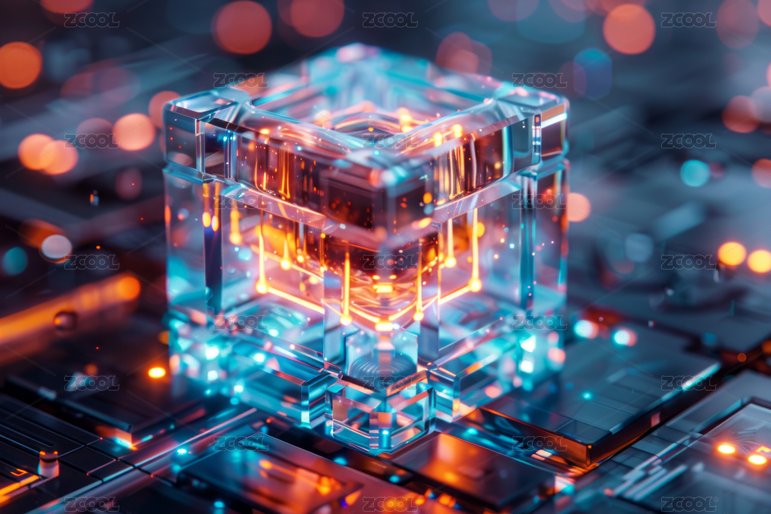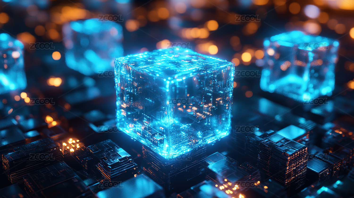 科技感十足的电路板上发光立方体