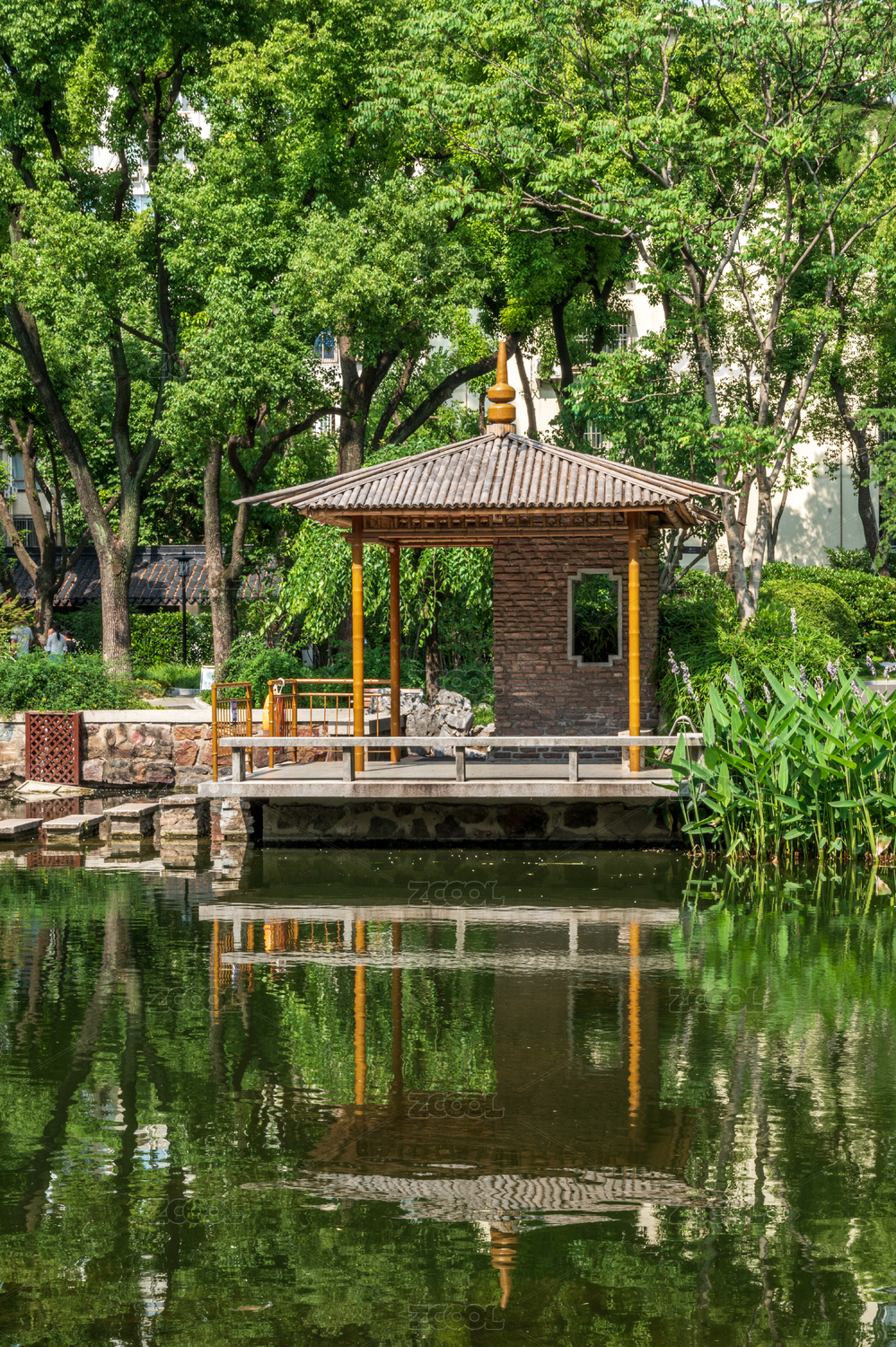 城市公园湖畔的凉亭及水中倒影