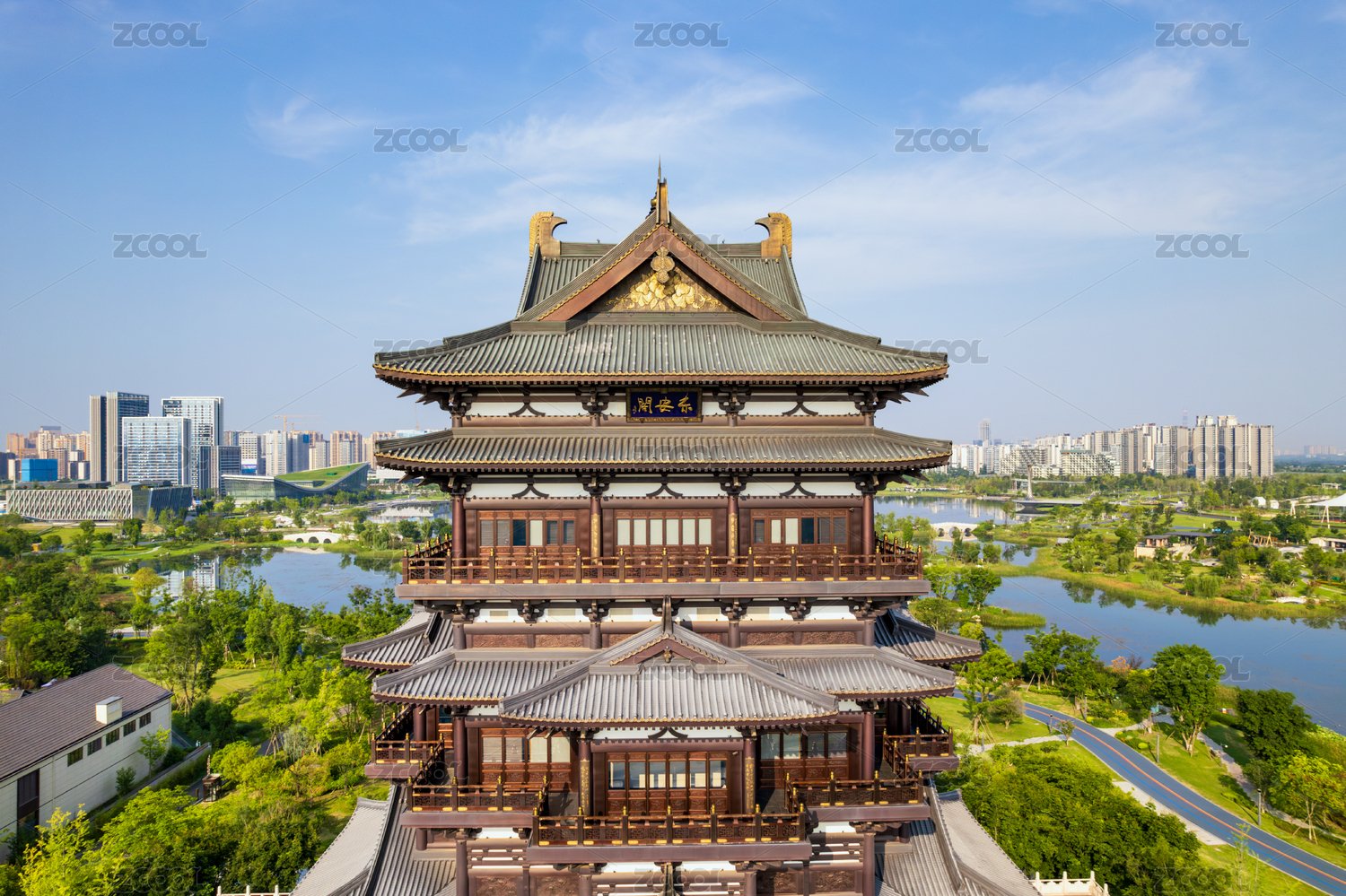 成都东安湖体育公园东安阁清晨航拍