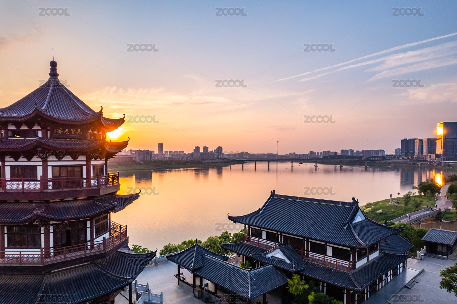 广州市文化馆中式传统建筑与海珠湖公园夕阳