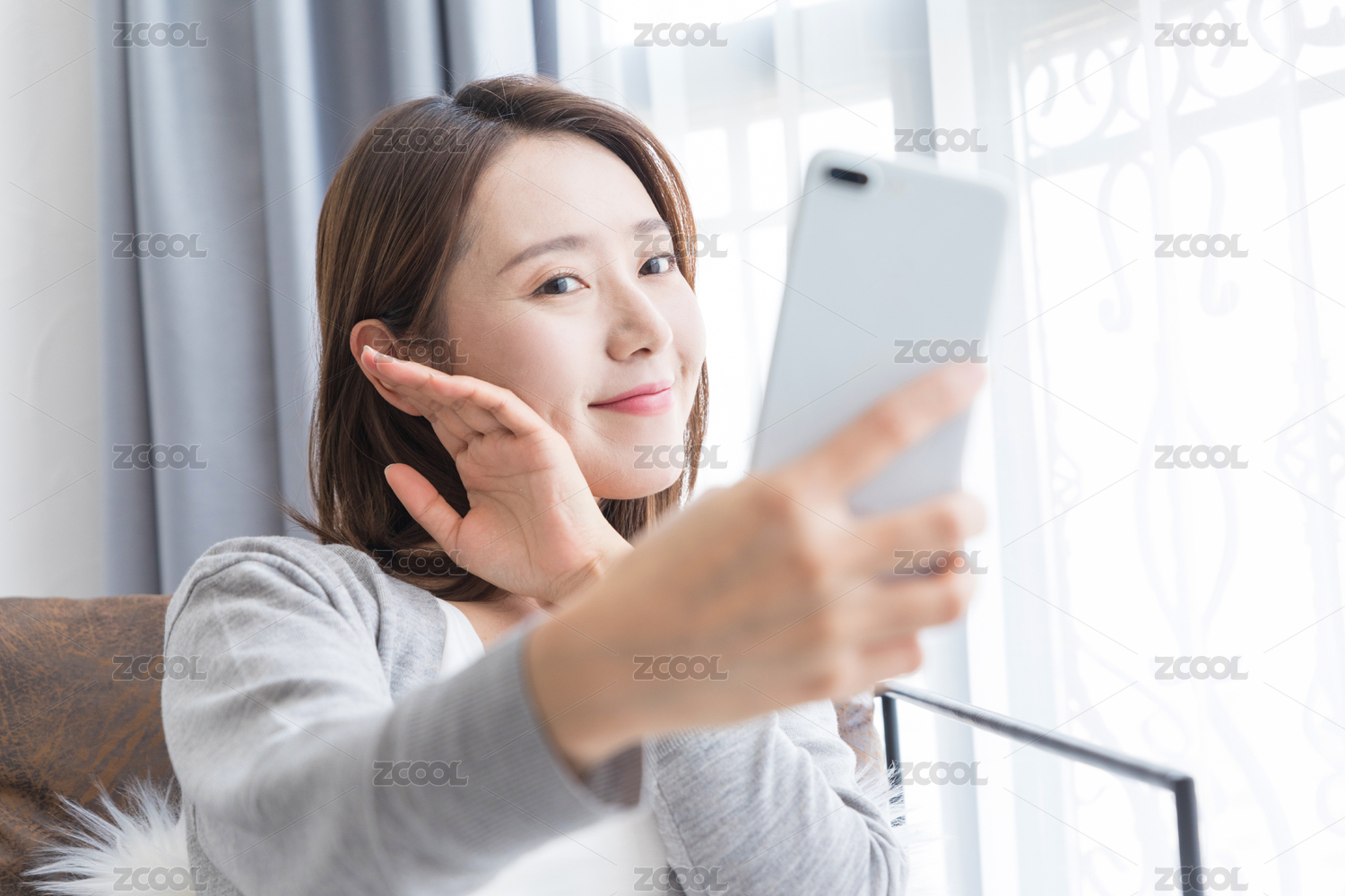 假期里一名年轻女性在窗边使用手机看电影追剧