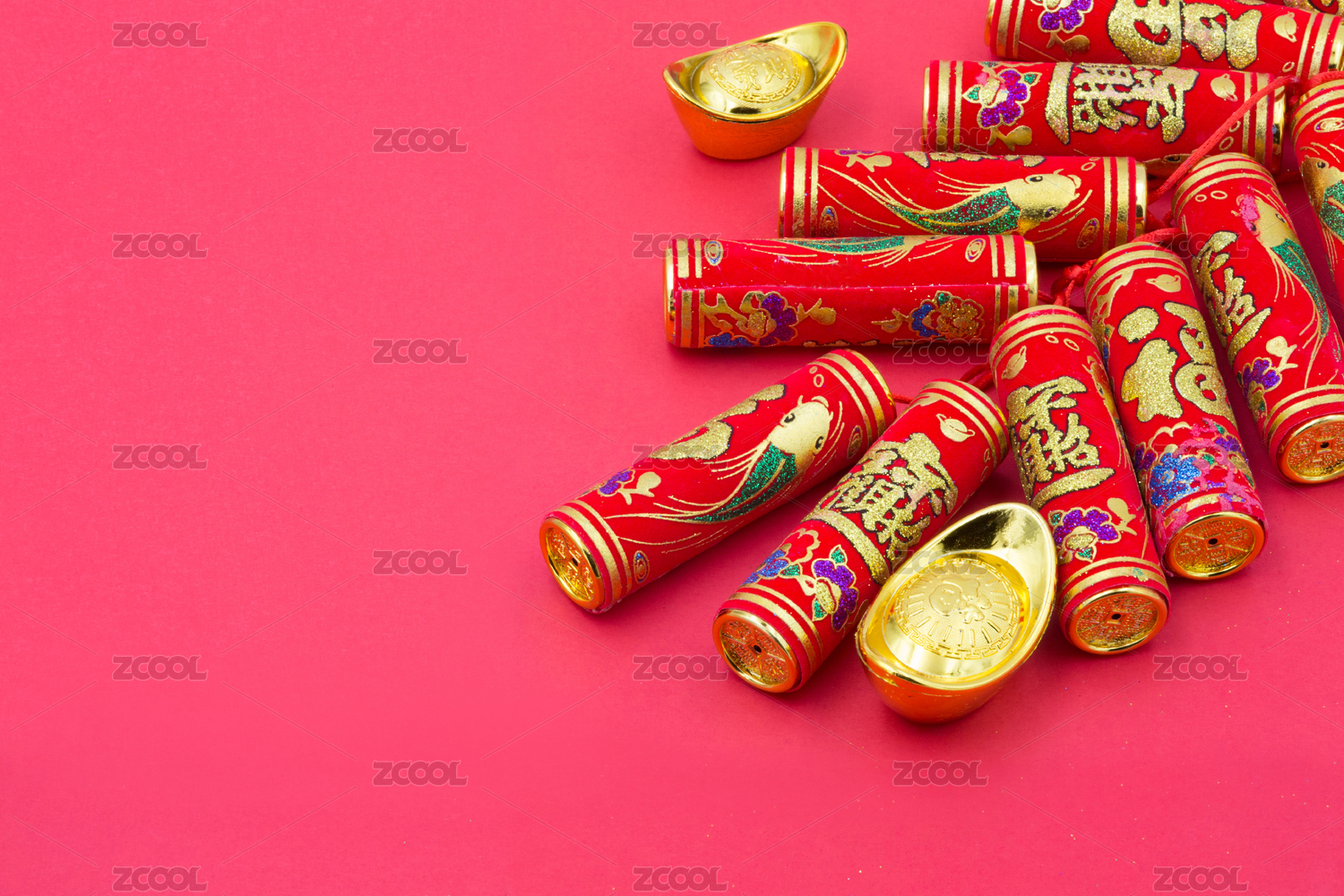 新年鞭炮金元宝红色背景