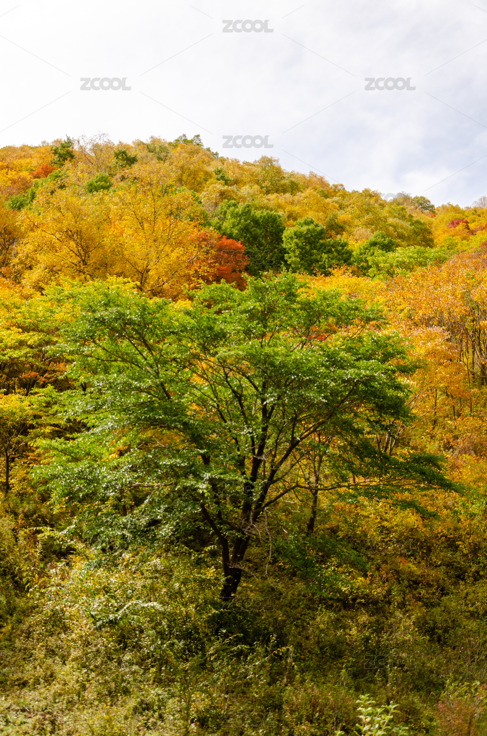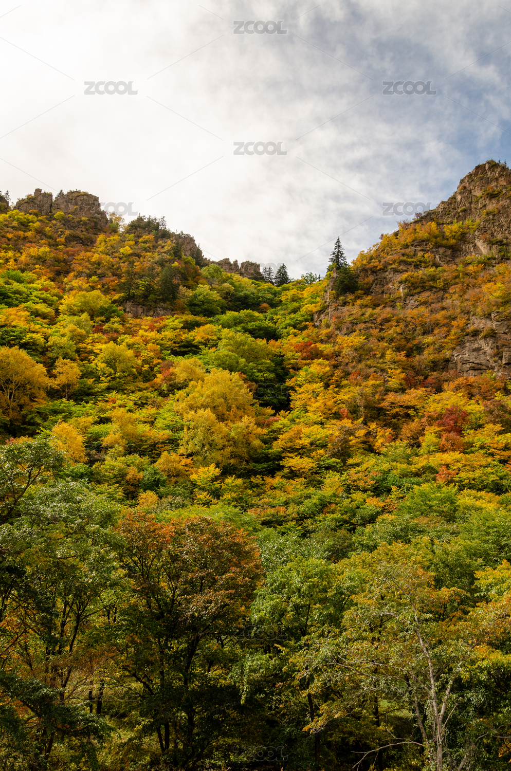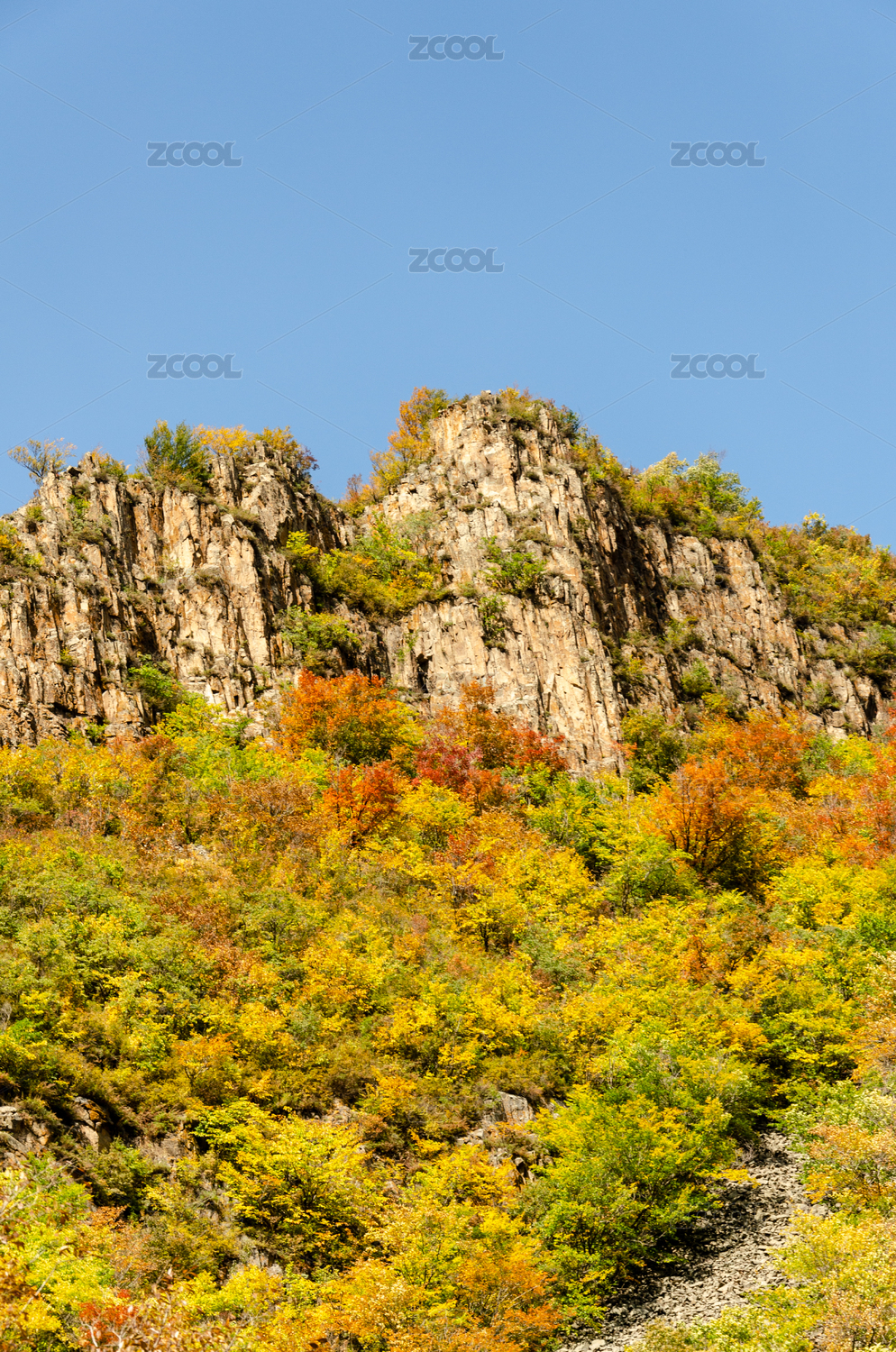 中国四川阿坝州茂县高山峭壁秋色彩林风景